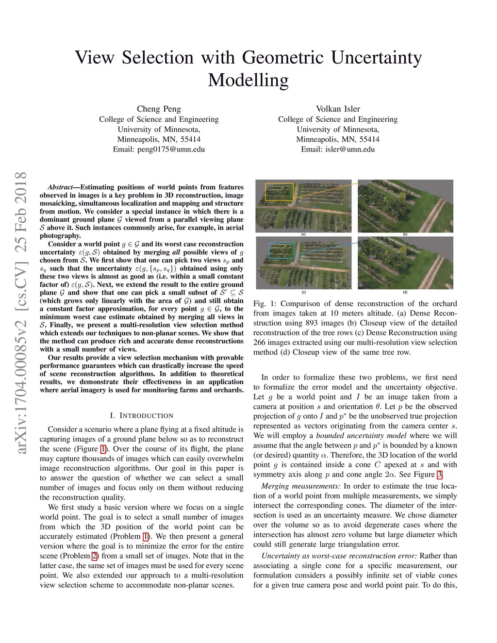 Estimating positions of world points from features observed in images is a key problem in 3D reconstruction, image mosaicking,simultaneous localization and mapping and structure from motion. We consider a special instance in which there is a dominant ground plane viewed from a parallel viewing plane above it. Such instances commonly arise, for example, in aerial photography. Consider a world point and its worst case reconstruction uncertainty obtained by merging \emph{all} possible views of chosen from . We first show that one can pick two views and such that the uncertainty obtained using only these two views is almost as good as (i.e. within a small constant factor of) . Next, we extend the result to the entire ground plane and show that one can pick a small subset of (which grows only linearly with the area of ) and still obtain a constant factor approximation, for every point , to the minimum worst case estimate obtained by merging all views in . Finally, we present a multi-resolution view selection method which extends our techniques to non-planar scenes. We show that the method can produce rich and accurate dense reconstructions with a small number of views. Our results provide a view selection mechanism with provable performance guarantees which can drastically increase the speed of scene reconstruction algorithms. In addition to theoretical results, we demonstrate their effectiveness in an application where aerial imagery is used for monitoring farms and orchards.