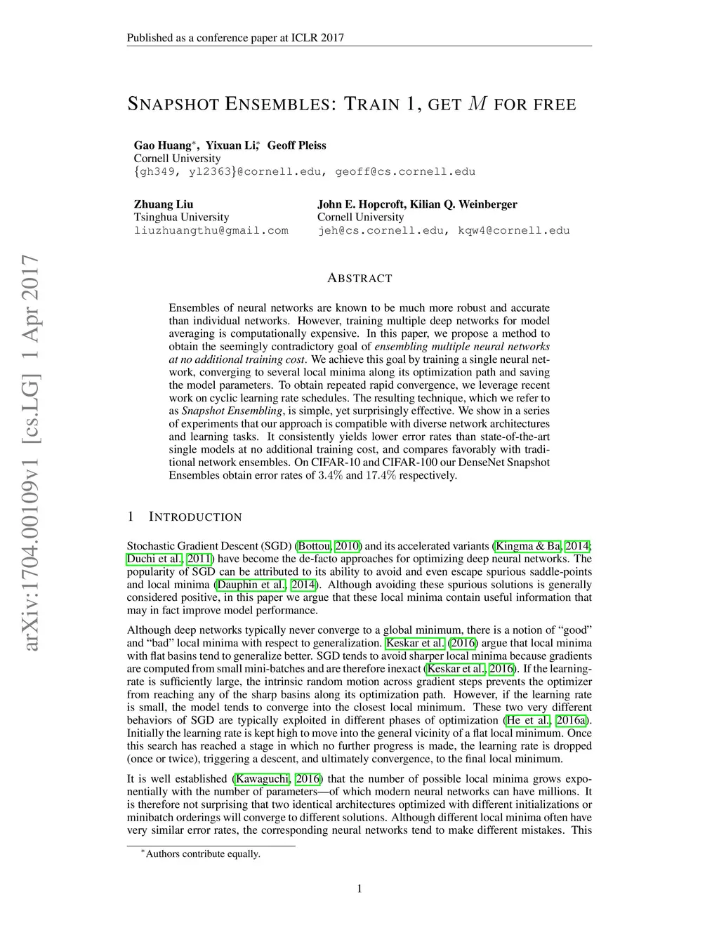 Ensembles of neural networks are known to be much more robust and accurate than individual networks. However, training multiple deep networks for model averaging is computationally expensive. In this paper, we propose a method to obtain the seemingly contradictory goal of ensembling multiple neural networks at no additional training cost. We achieve this goal by training a single neural network, converging to several local minima along its optimization path and saving the model parameters. To obtain repeated rapid convergence, we leverage recent work on cyclic learning rate schedules. The resulting technique, which we refer to as Snapshot Ensembling, is simple, yet surprisingly effective. We show in a series of experiments that our approach is compatible with diverse network architectures and learning tasks. It consistently yields lower error rates than state-of-the-art single models at no additional training cost, and compares favorably with traditional network ensembles. On CIFAR-10 and CIFAR-100 our DenseNet Snapshot Ensembles obtain error rates of 3.4% and 17.4% respectively.