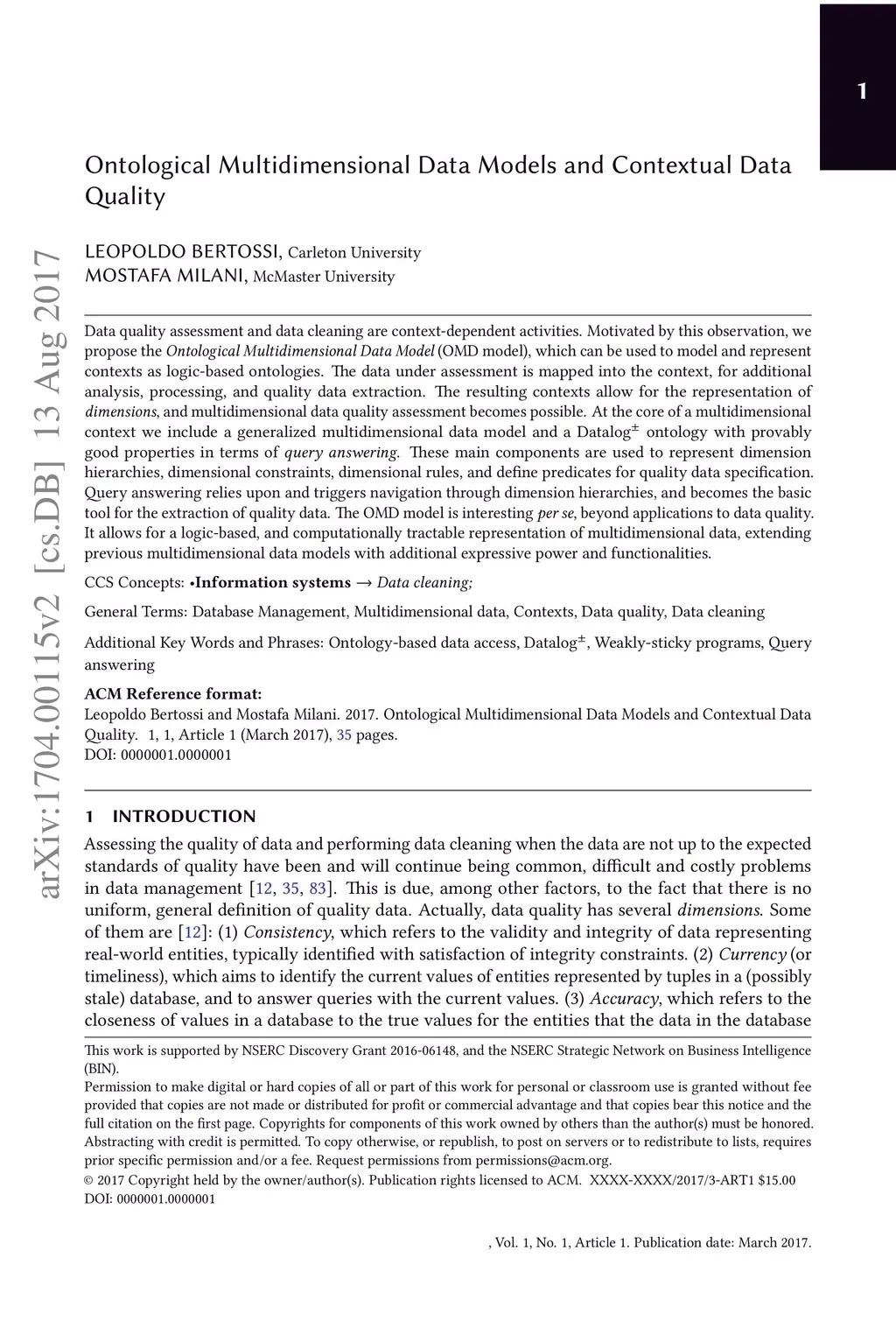 Ontological Multidimensional Data Models and Contextual Data Qality