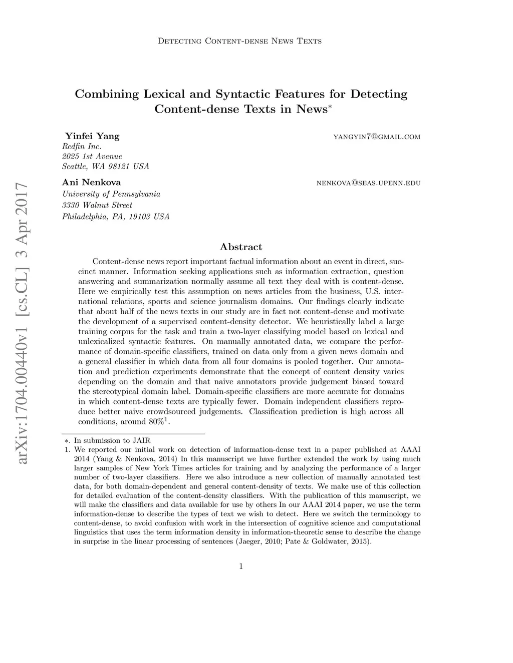 Combining Lexical and Syntactic Features for Detecting Content-dense