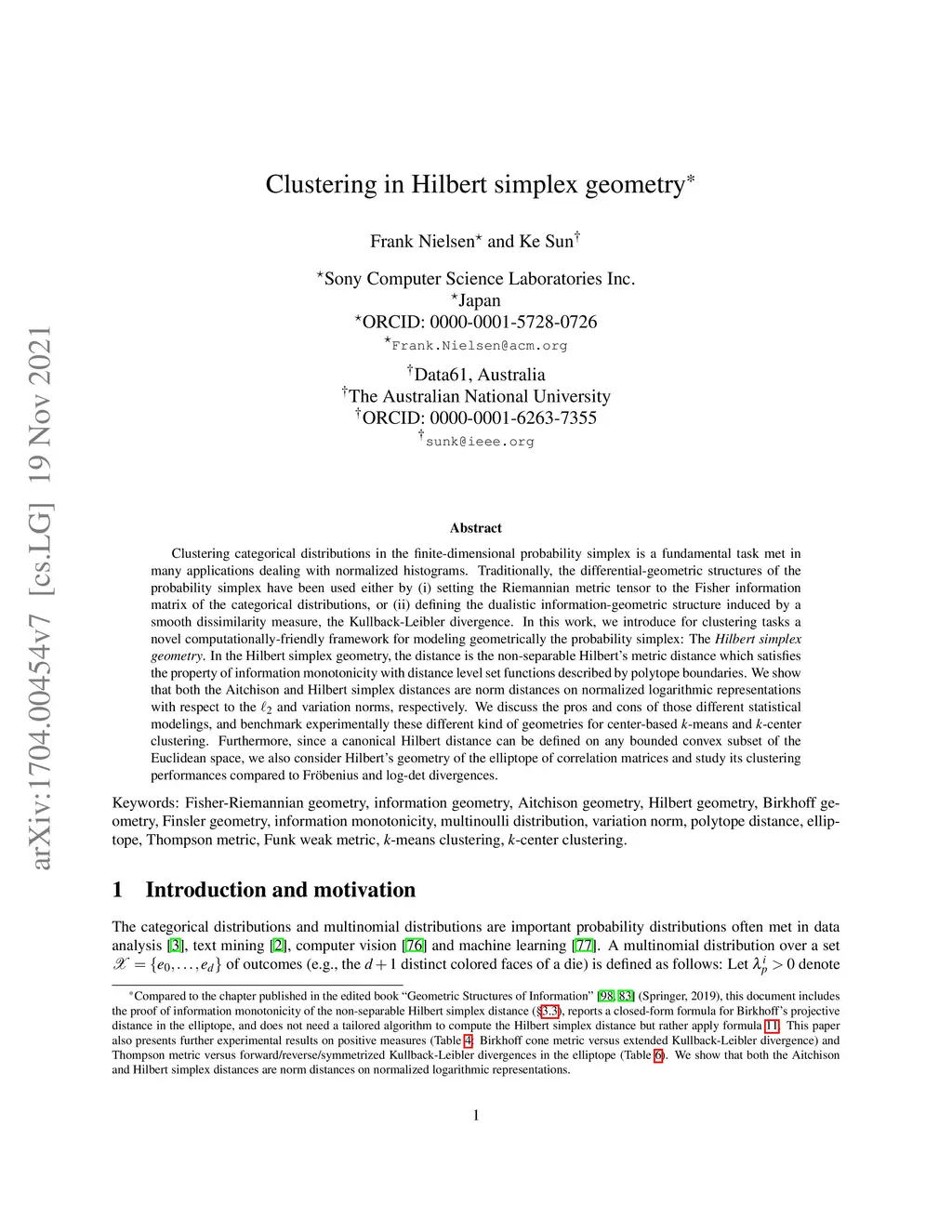 Clustering categorical distributions in the finite-dimensional probability simplex is a fundamental task met in many applications dealing with normalized histograms. Traditionally, the differential-geometric structures of the probability simplex have been used either by (i) setting the Riemannian metric tensor to the Fisher information matrix of the categorical distributions, or (ii) defining the dualistic information-geometric structure induced by a smooth dissimilarity measure, the Kullback-Leibler divergence. In this work, we introduce for clustering tasks a novel computationally-friendly framework for modeling geometrically the probability simplex: The {\em Hilbert simplex geometry}. In the Hilbert simplex geometry, the distance is the non-separable Hilbert's metric distance which satisfies the property of information monotonicity with distance level set functions described by polytope boundaries. We show that both the Aitchison and Hilbert simplex distances are norm distances on normalized logarithmic representations with respect to the and variation norms, respectively. We discuss the pros and cons of those different statistical modelings, and benchmark experimentally these different kind of geometries for center-based -means and -center clustering. Furthermore, since a canonical Hilbert distance can be defined on any bounded convex subset of the Euclidean space, we also consider Hilbert's geometry of the elliptope of correlation matrices and study its clustering performances compared to Fr\"obenius and log-det divergences.