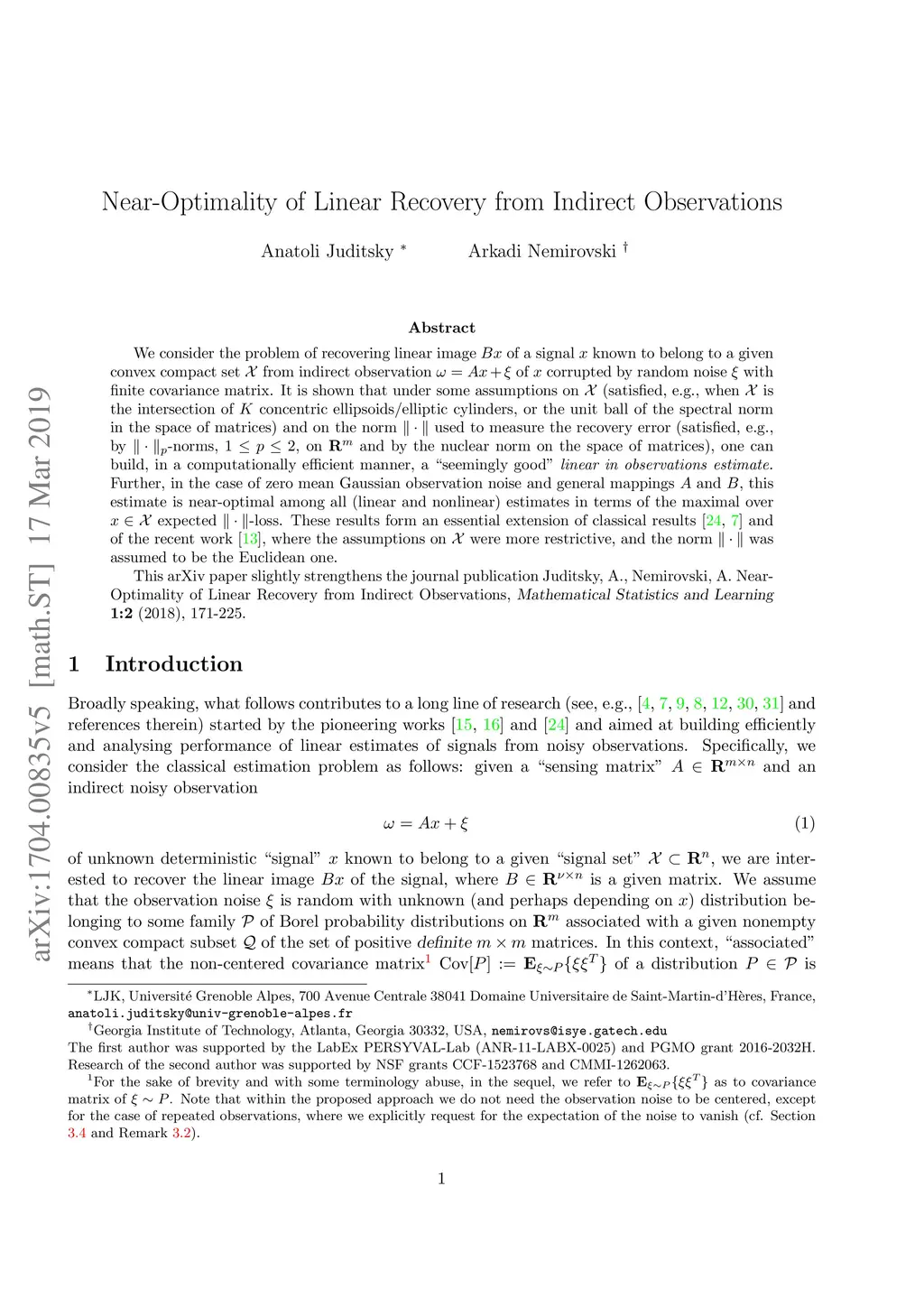We consider the problem of recovering linear image of a signal known to belong to a given convex compact set from indirect observation of corrupted by random noise with finite covariance matrix. It is shown that under some assumptions on (satisfied, e.g., when is the intersection of concentric ellipsoids/elliptic cylinders, or the unit ball of the spectral norm in the space of matrices) and on the norm used to measure the recovery error (satisfied, e.g., by -norms, , on and by the nuclear norm on the space of matrices), one can build, in a computationally efficient manner, a "presumably good" linear in observations estimate, and that in the case of zero mean Gaussian observation noise, this estimate is near-optimal among all (linear and nonlinear) estimates in terms of its worst-case, over , expected -loss. These results form an essential extension of those in our paper arXiv:1602.01355, where the assumptions on were more restrictive, and the norm was assumed to be the Euclidean one. In addition, we develop near-optimal estimates for the case of "uncertain-but-bounded" noise, where all we know about is that it is bounded in a given norm by a given . Same as in arXiv:1602.01355, our results impose no restrictions on and . This arXiv paper slightly strengthens the journal publication Juditsky, A., Nemirovski, A. "Near-Optimality of Linear Recovery from Indirect Observations," Mathematical Statistics and Learning 1:2 (2018), 171-225.