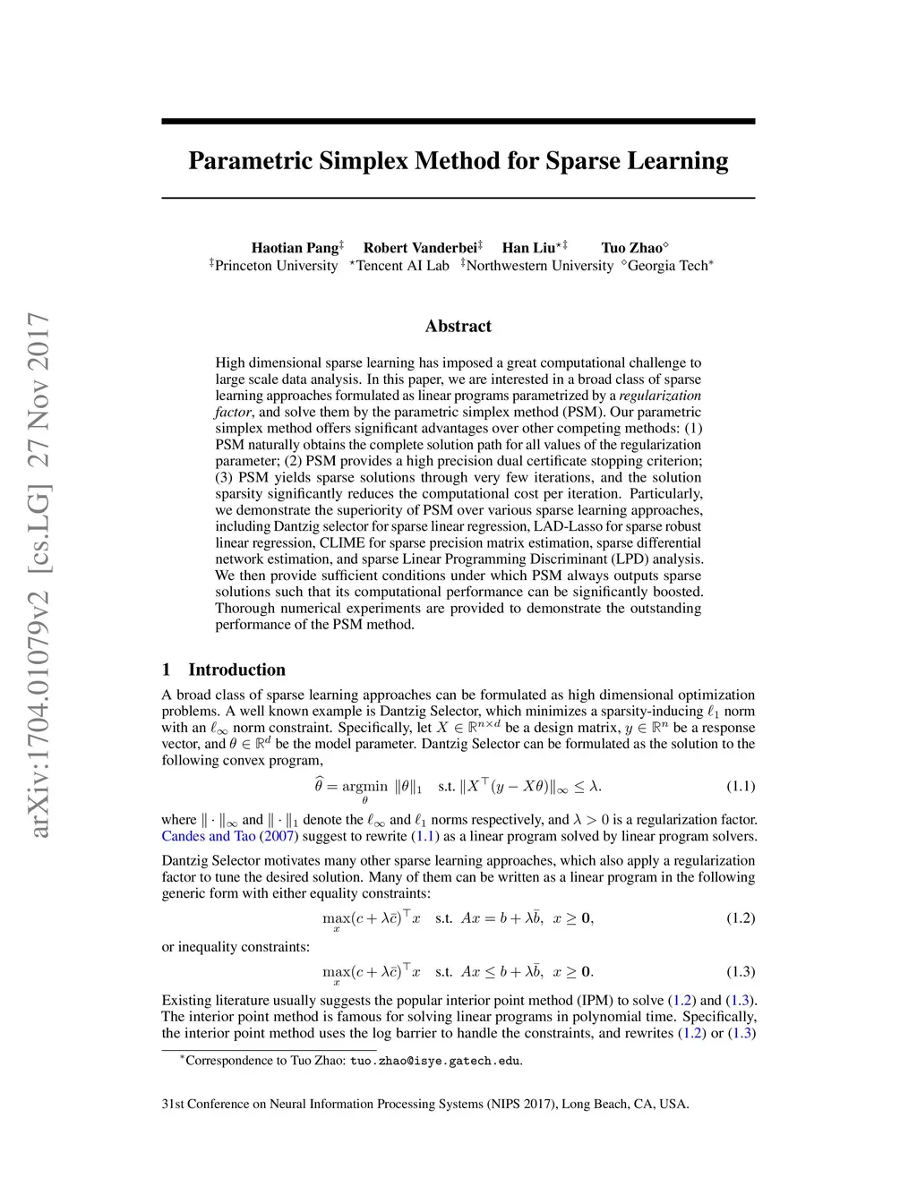 High dimensional sparse learning has imposed a great computational challenge to large scale data analysis. In this paper, we are interested in a broad class of sparse learning approaches formulated as linear programs parametrized by a {\em regularization factor}, and solve them by the parametric simplex method (PSM). Our parametric simplex method offers significant advantages over other competing methods: (1) PSM naturally obtains the complete solution path for all values of the regularization parameter; (2) PSM provides a high precision dual certificate stopping criterion; (3) PSM yields sparse solutions through very few iterations, and the solution sparsity significantly reduces the computational cost per iteration. Particularly, we demonstrate the superiority of PSM over various sparse learning approaches, including Dantzig selector for sparse linear regression, LAD-Lasso for sparse robust linear regression, CLIME for sparse precision matrix estimation, sparse differential network estimation, and sparse Linear Programming Discriminant (LPD) analysis. We then provide sufficient conditions under which PSM always outputs sparse solutions such that its computational performance can be significantly boosted. Thorough numerical experiments are provided to demonstrate the outstanding performance of the PSM method.