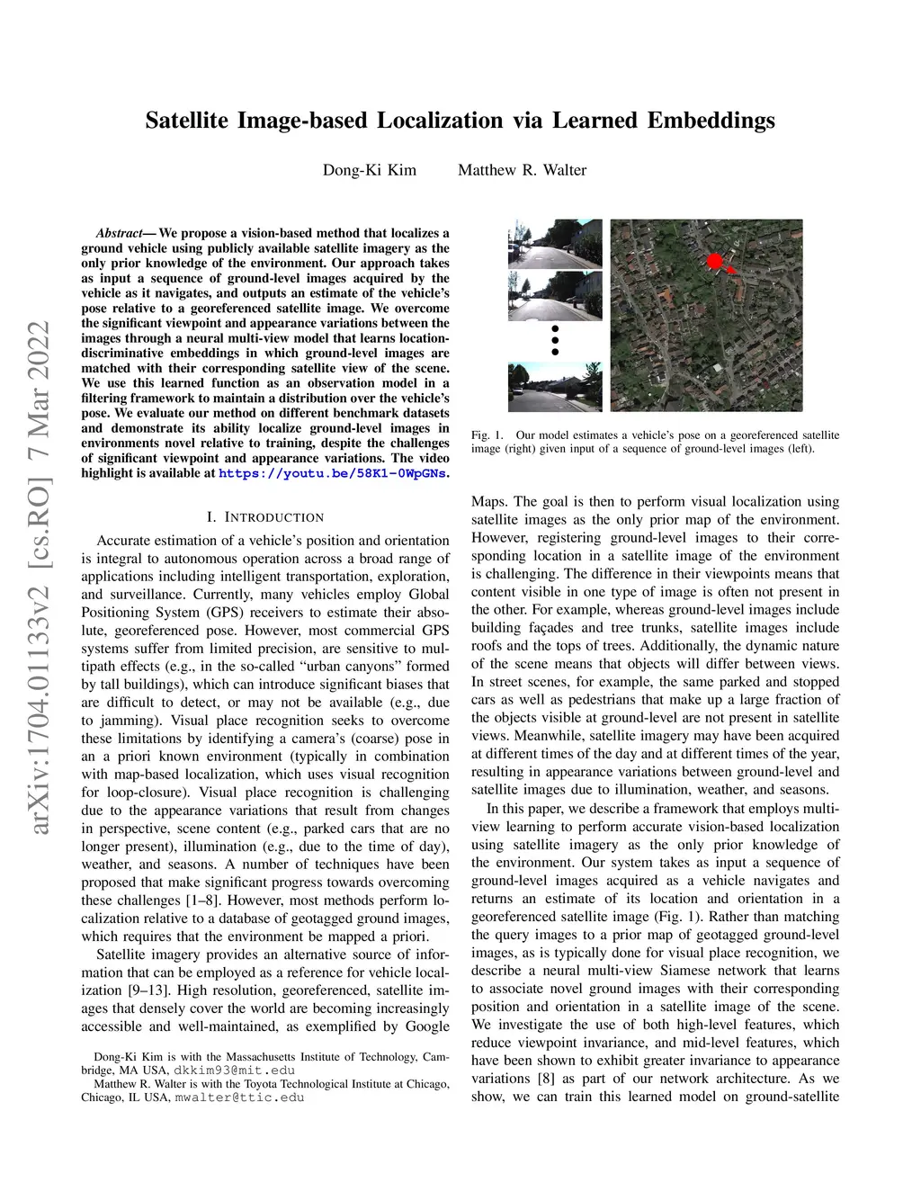 We propose a vision-based method that localizes a ground vehicle using publicly available satellite imagery as the only prior knowledge of the environment. Our approach takes as input a sequence of ground-level images acquired by the vehicle as it navigates, and outputs an estimate of the vehicle's pose relative to a georeferenced satellite image. We overcome the significant viewpoint and appearance variations between the images through a neural multi-view model that learns location-discriminative embeddings in which ground-level images are matched with their corresponding satellite view of the scene. We use this learned function as an observation model in a filtering framework to maintain a distribution over the vehicle's pose. We evaluate our method on different benchmark datasets and demonstrate its ability localize ground-level images in environments novel relative to training, despite the challenges of significant viewpoint and appearance variations.