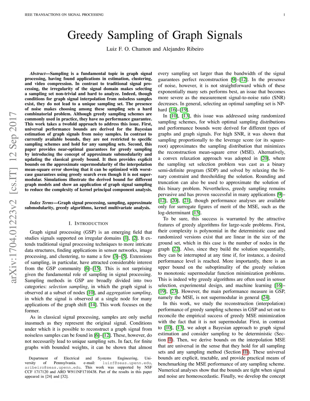 Sampling is a fundamental topic in graph signal processing, having found applications in estimation, clustering, and video compression. In contrast to traditional signal processing, the irregularity of the signal domain makes selecting a sampling set non-trivial and hard to analyze. Indeed, though conditions for graph signal interpolation from noiseless samples exist, they do not lead to a unique sampling set. The presence of noise makes choosing among these sampling sets a hard combinatorial problem. Although greedy sampling schemes are commonly used in practice, they have no performance guarantee. This work takes a twofold approach to address this issue. First, universal performance bounds are derived for the Bayesian estimation of graph signals from noisy samples. In contrast to currently available bounds, they are not restricted to specific sampling schemes and hold for any sampling sets. Second, this paper provides near-optimal guarantees for greedy sampling by introducing the concept of approximate submodularity and updating the classical greedy bound. It then provides explicit bounds on the approximate supermodularity of the interpolation mean-square error showing that it can be optimized with worst-case guarantees using greedy search even though it is not supermodular. Simulations illustrate the derived bound for different graph models and show an application of graph signal sampling to reduce the complexity of kernel principal component analysis.