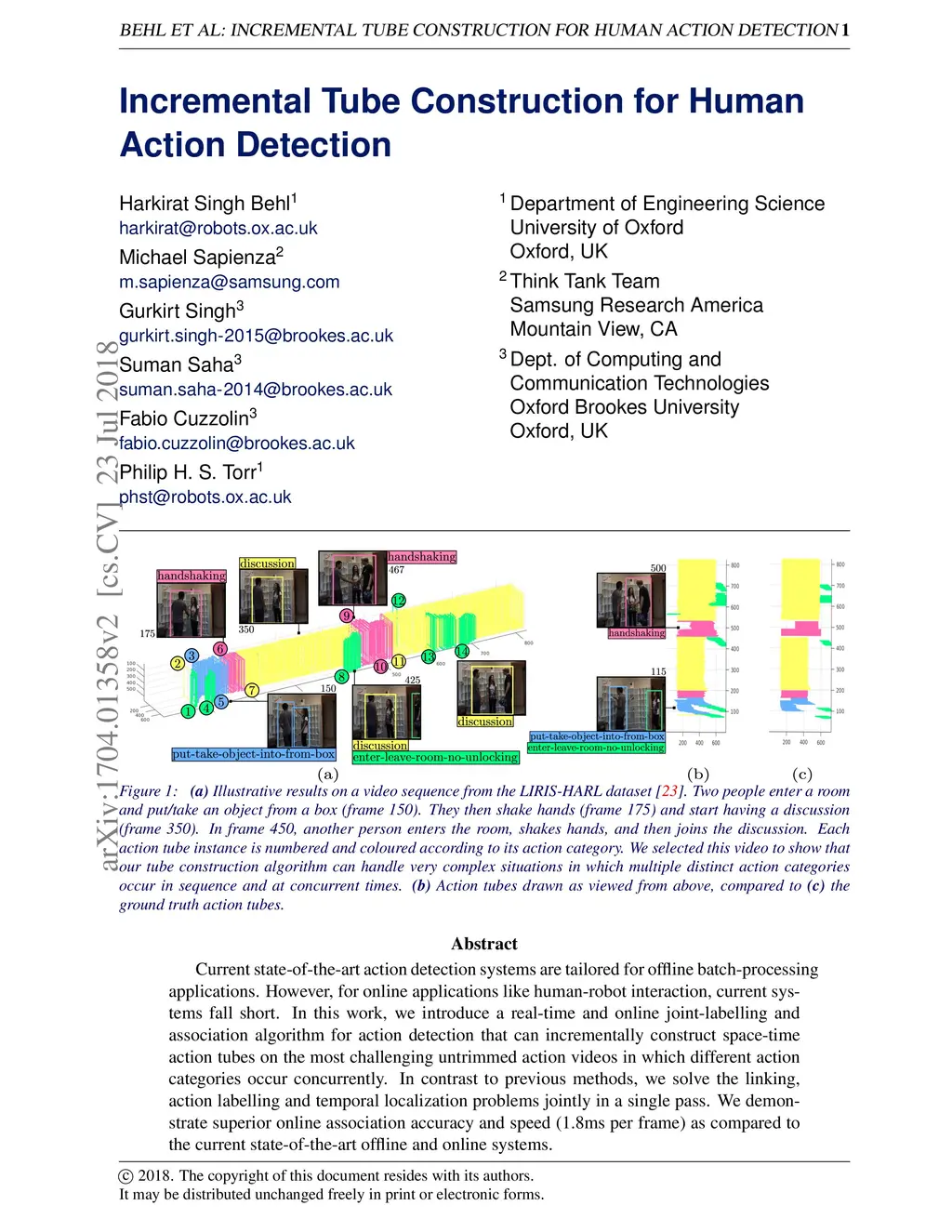Current state-of-the-art action detection systems are tailored for offline batch-processing applications. However, for online applications like human-robot interaction, current systems fall short, either because they only detect one action per video, or because they assume that the entire video is available ahead of time. In this work, we introduce a real-time and online joint-labelling and association algorithm for action detection that can incrementally construct space-time action tubes on the most challenging action videos in which different action categories occur concurrently. In contrast to previous methods, we solve the detection-window association and action labelling problems jointly in a single pass. We demonstrate superior online association accuracy and speed (2.2ms per frame) as compared to the current state-of-the-art offline systems. We further demonstrate that the entire action detection pipeline can easily be made to work effectively in real-time using our action tube construction algorithm.