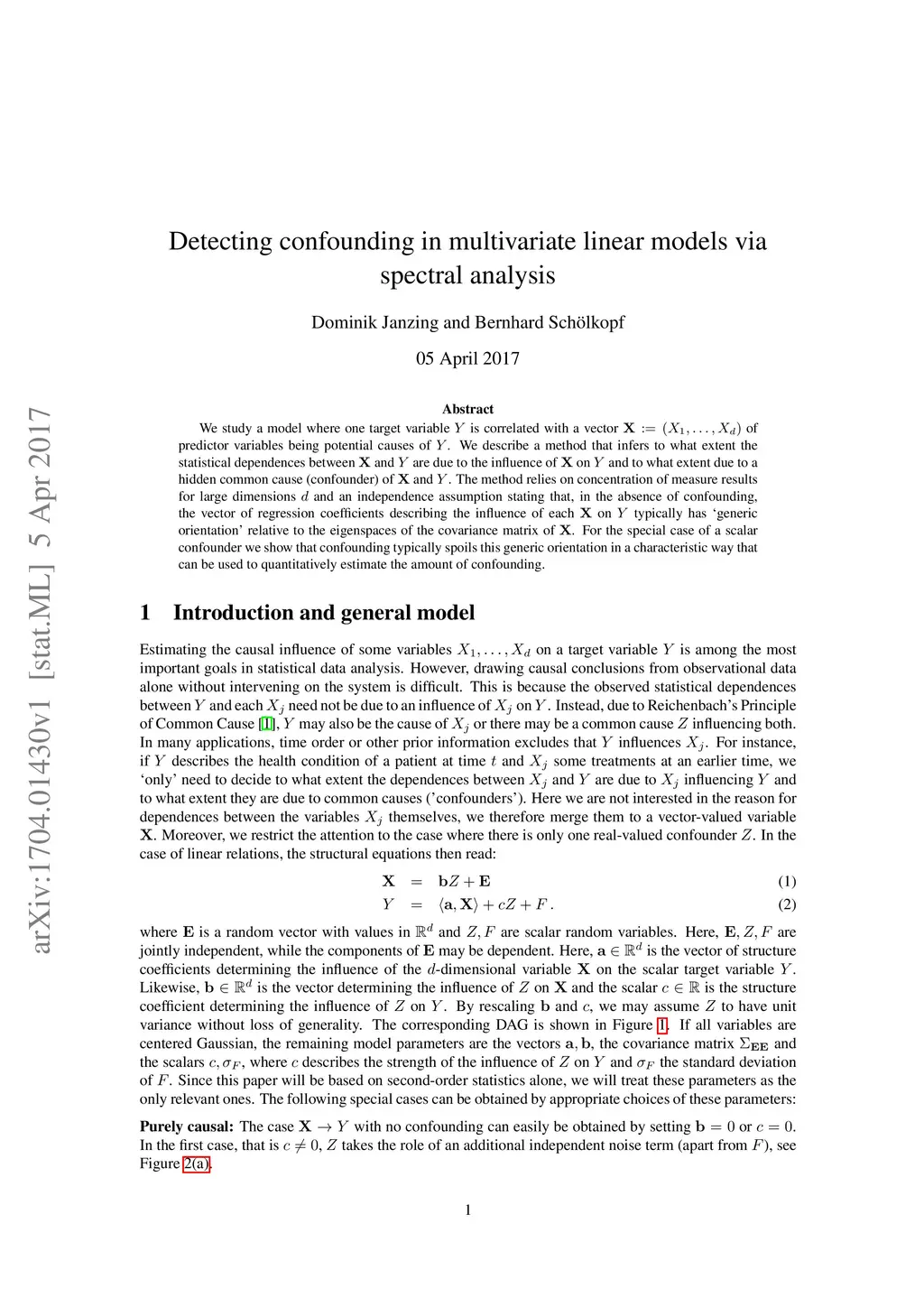 We study a model where one target variable Y is correlated with a vector X:=(X_1,...,X_d) of predictor variables being potential causes of Y. We describe a method that infers to what extent the statistical dependences between X and Y are due to the influence of X on Y and to what extent due to a hidden common cause (confounder) of X and Y. The method relies on concentration of measure results for large dimensions d and an independence assumption stating that, in the absence of confounding, the vector of regression coefficients describing the influence of each X on Y typically has `generic orientation' relative to the eigenspaces of the covariance matrix of X. For the special case of a scalar confounder we show that confounding typically spoils this generic orientation in a characteristic way that can be used to quantitatively estimate the amount of confounding.