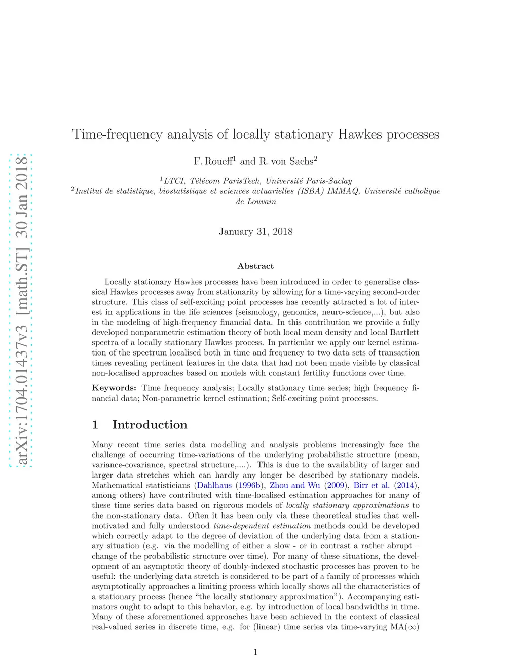 Locally stationary Hawkes processes have been introduced in order to generalise classical Hawkes processes away from stationarity by allowing for a time-varying second-order structure. This class of self-exciting point processes has recently attracted a lot of interest in applications in the life sciences (seismology, genomics, neuro-science,...), but also in the modelling of high-frequency financial data. In this contribution we provide a fully developed nonparametric estimation theory of both local mean density and local Bartlett spectra of a locally stationary Hawkes process. In particular we apply our kernel estimation of the spectrum localised both in time and frequency to two data sets of transaction times revealing pertinent features in the data that had not been made visible by classical non-localised approaches based on models with constant fertility functions over time.