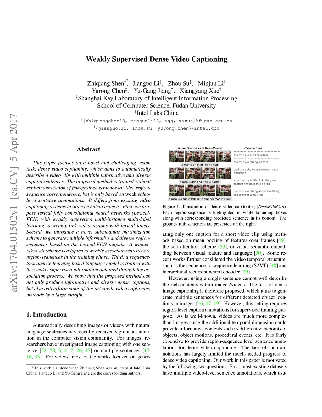 This paper focuses on a novel and challenging vision task, dense video captioning, which aims to automatically describe a video clip with multiple informative and diverse caption sentences. The proposed method is trained without explicit annotation of fine-grained sentence to video region-sequence correspondence, but is only based on weak video-level sentence annotations. It differs from existing video captioning systems in three technical aspects. First, we propose lexical fully convolutional neural networks (Lexical-FCN) with weakly supervised multi-instance multi-label learning to weakly link video regions with lexical labels. Second, we introduce a novel submodular maximization scheme to generate multiple informative and diverse region-sequences based on the Lexical-FCN outputs. A winner-takes-all scheme is adopted to weakly associate sentences to region-sequences in the training phase. Third, a sequence-to-sequence learning based language model is trained with the weakly supervised information obtained through the association process. We show that the proposed method can not only produce informative and diverse dense captions, but also outperform state-of-the-art single video captioning methods by a large margin.