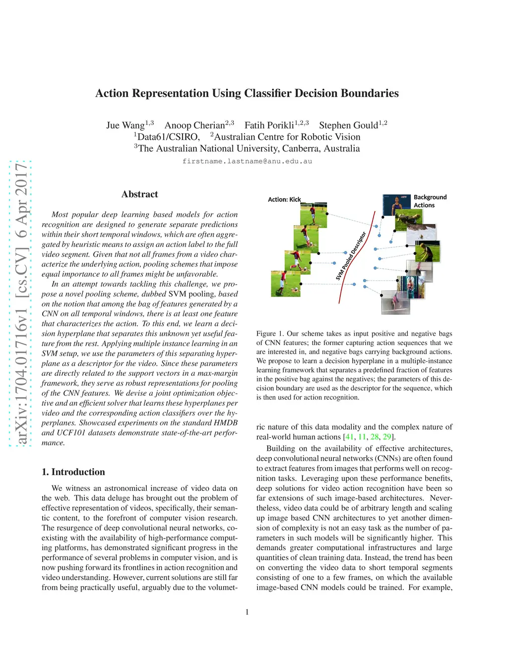 Most popular deep learning based models for action recognition are designed to generate separate predictions within their short temporal windows, which are often aggregated by heuristic means to assign an action label to the full video segment. Given that not all frames from a video characterize the underlying action, pooling schemes that impose equal importance to all frames might be unfavorable. In an attempt towards tackling this challenge, we propose a novel pooling scheme, dubbed SVM pooling, based on the notion that among the bag of features generated by a CNN on all temporal windows, there is at least one feature that characterizes the action. To this end, we learn a decision hyperplane that separates this unknown yet useful feature from the rest. Applying multiple instance learning in an SVM setup, we use the parameters of this separating hyperplane as a descriptor for the video. Since these parameters are directly related to the support vectors in a max-margin framework, they serve as robust representations for pooling of the CNN features. We devise a joint optimization objective and an efficient solver that learns these hyperplanes per video and the corresponding action classifiers over the hyperplanes. Showcased experiments on the standard HMDB and UCF101 datasets demonstrate state-of-the-art performance.