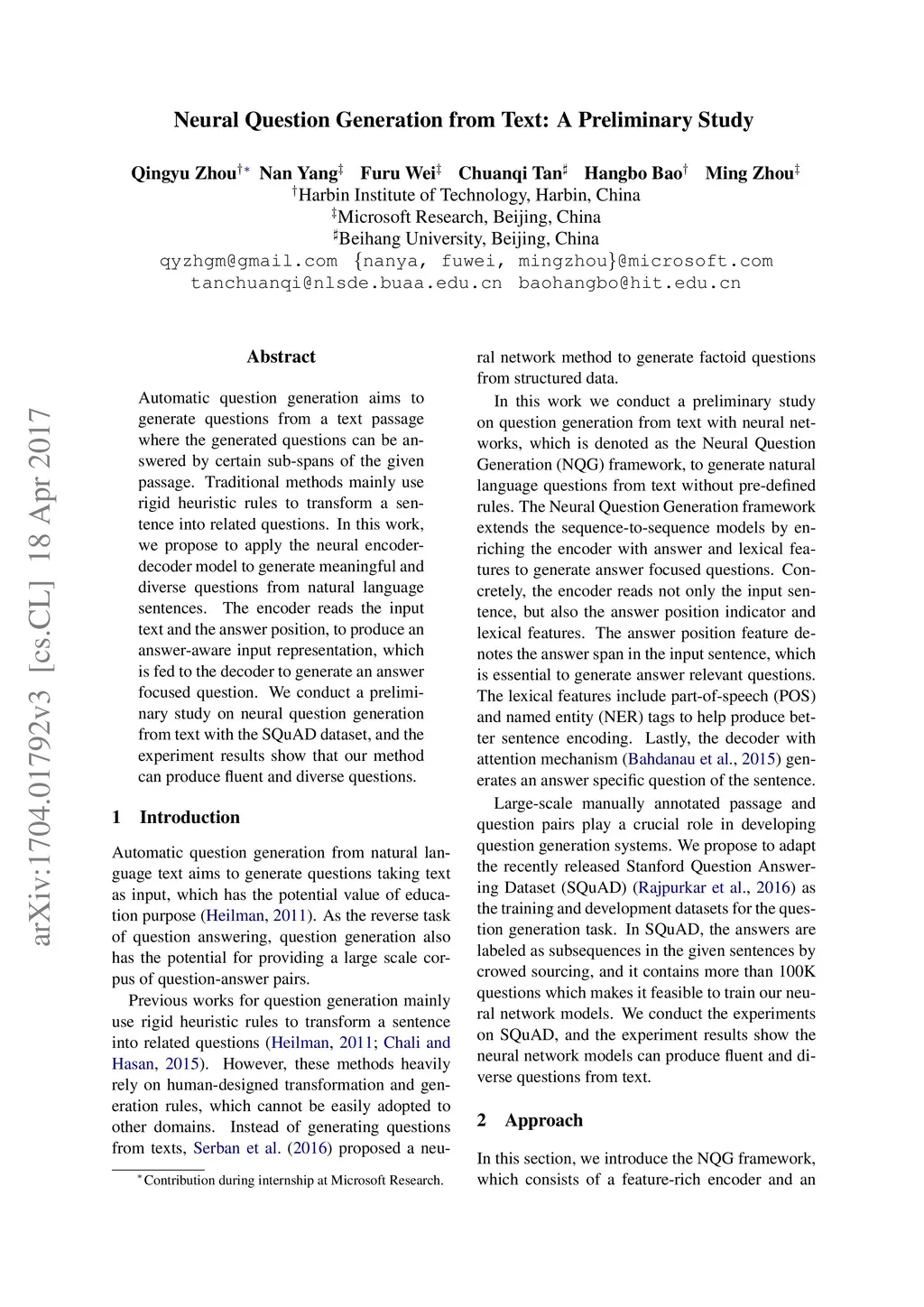 Automatic question generation aims to generate questions from a text passage where the generated questions can be answered by certain sub-spans of the given passage. Traditional methods mainly use rigid heuristic rules to transform a sentence into related questions. In this work, we propose to apply the neural encoder-decoder model to generate meaningful and diverse questions from natural language sentences. The encoder reads the input text and the answer position, to produce an answer-aware input representation, which is fed to the decoder to generate an answer focused question. We conduct a preliminary study on neural question generation from text with the SQuAD dataset, and the experiment results show that our method can produce fluent and diverse questions.