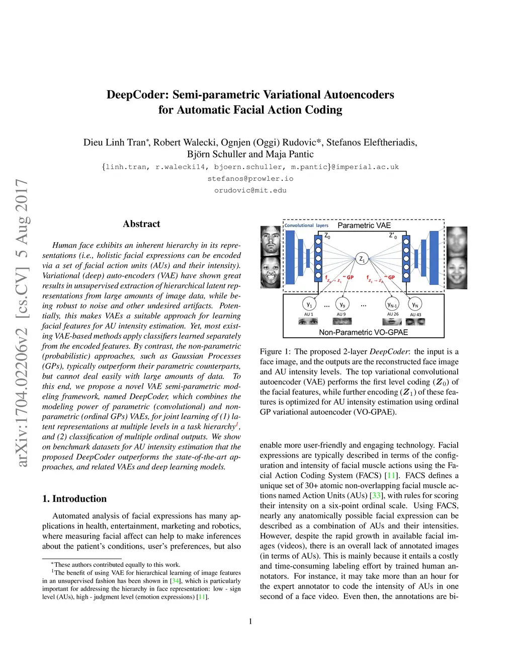 Human face exhibits an inherent hierarchy in its representations (i.e., holistic facial expressions can be encoded via a set of facial action units (AUs) and their intensity). Variational (deep) auto-encoders (VAE) have shown great results in unsupervised extraction of hierarchical latent representations from large amounts of image data, while being robust to noise and other undesired artifacts. Potentially, this makes VAEs a suitable approach for learning facial features for AU intensity estimation. Yet, most existing VAE-based methods apply classifiers learned separately from the encoded features. By contrast, the non-parametric (probabilistic) approaches, such as Gaussian Processes (GPs), typically outperform their parametric counterparts, but cannot deal easily with large amounts of data. To this end, we propose a novel VAE semi-parametric modeling framework, named DeepCoder, which combines the modeling power of parametric (convolutional) and nonparametric (ordinal GPs) VAEs, for joint learning of (1) latent representations at multiple levels in a task hierarchy1, and (2) classification of multiple ordinal outputs. We show on benchmark datasets for AU intensity estimation that the proposed DeepCoder outperforms the state-of-the-art approaches, and related VAEs and deep learning models.