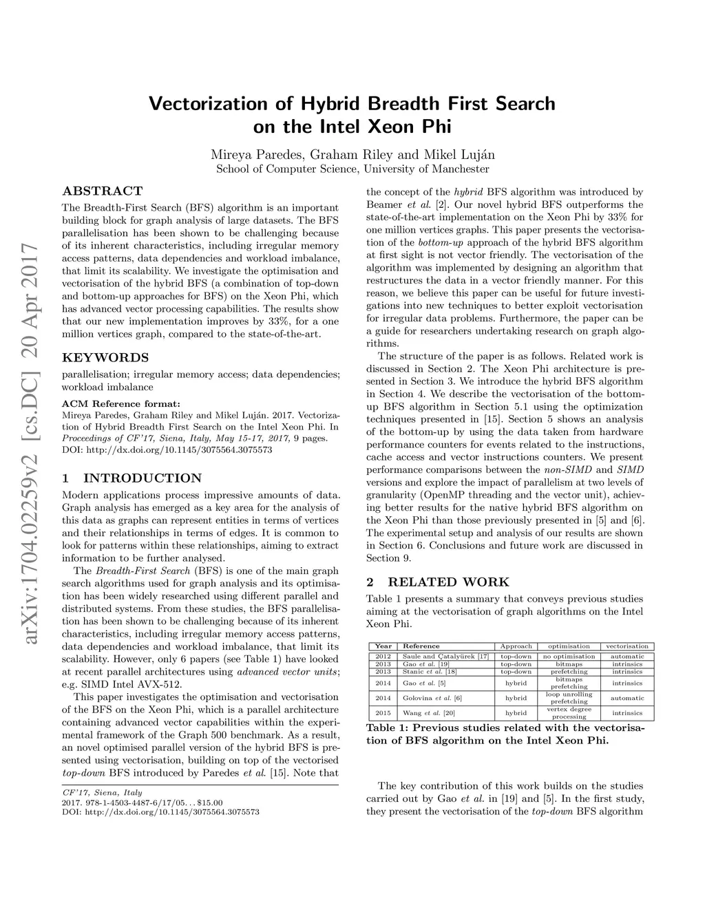 The Breadth-First Search (BFS) algorithm is an important building block for graph analysis of large datasets. The BFS parallelisation has been shown to be challenging because of its inherent characteristics, including irregular memory access patterns, data dependencies and workload imbalance, that limit its scalability. We investigate the optimisation and vectorisation of the hybrid BFS (a combination of top-down and bottom-up approaches for BFS) on the Xeon Phi, which has advanced vector processing capabilities. The results show that our new implementation improves by 33\%, for a one million vertices graph, compared to the state-of-the-art.