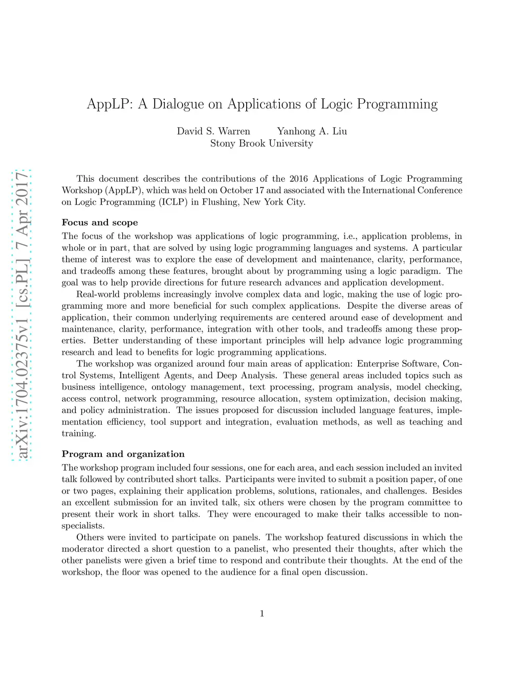 This document describes the contributions of the 2016 Applications of Logic Programming Workshop (AppLP), which was held on October 17 and associated with the International Conference on Logic Programming (ICLP) in Flushing, New York City.