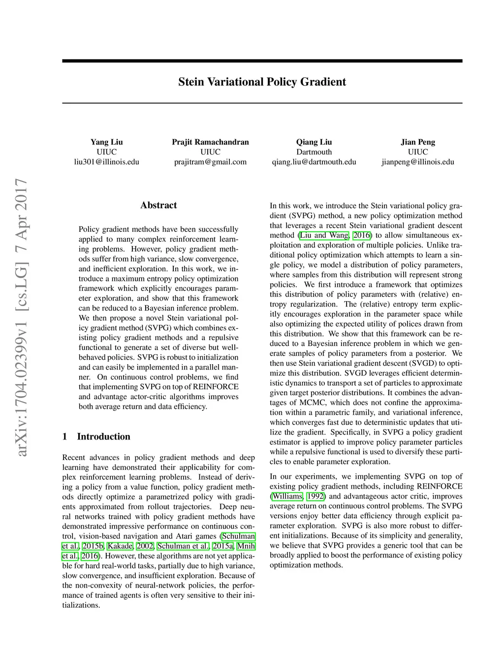 Policy gradient methods have been successfully applied to many complex reinforcement learning problems. However, policy gradient methods suffer from high variance, slow convergence, and inefficient exploration. In this work, we introduce a maximum entropy policy optimization framework which explicitly encourages parameter exploration, and show that this framework can be reduced to a Bayesian inference problem. We then propose a novel Stein variational policy gradient method (SVPG) which combines existing policy gradient methods and a repulsive functional to generate a set of diverse but well-behaved policies. SVPG is robust to initialization and can easily be implemented in a parallel manner. On continuous control problems, we find that implementing SVPG on top of REINFORCE and advantage actor-critic algorithms improves both average return and data efficiency.