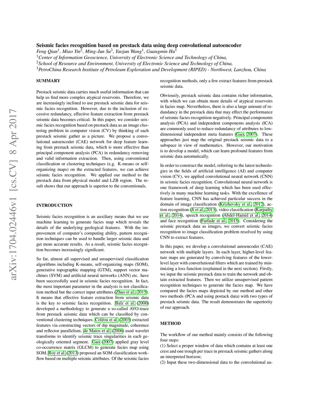 Prestack seismic data carries much useful information that can help us find more complex atypical reservoirs. Therefore, we are increasingly inclined to use prestack seismic data for seis- mic facies recognition. However, due to the inclusion of ex- cessive redundancy, effective feature extraction from prestack seismic data becomes critical. In this paper, we consider seis- mic facies recognition based on prestack data as an image clus- tering problem in computer vision (CV) by thinking of each prestack seismic gather as a picture. We propose a convo- lutional autoencoder (CAE) network for deep feature learn- ing from prestack seismic data, which is more effective than principal component analysis (PCA) in redundancy removing and valid information extraction. Then, using conventional classification or clustering techniques (e.g. K-means or self- organizing maps) on the extracted features, we can achieve seismic facies recognition. We applied our method to the prestack data from physical model and LZB region. The re- sult shows that our approach is superior to the conventionals.