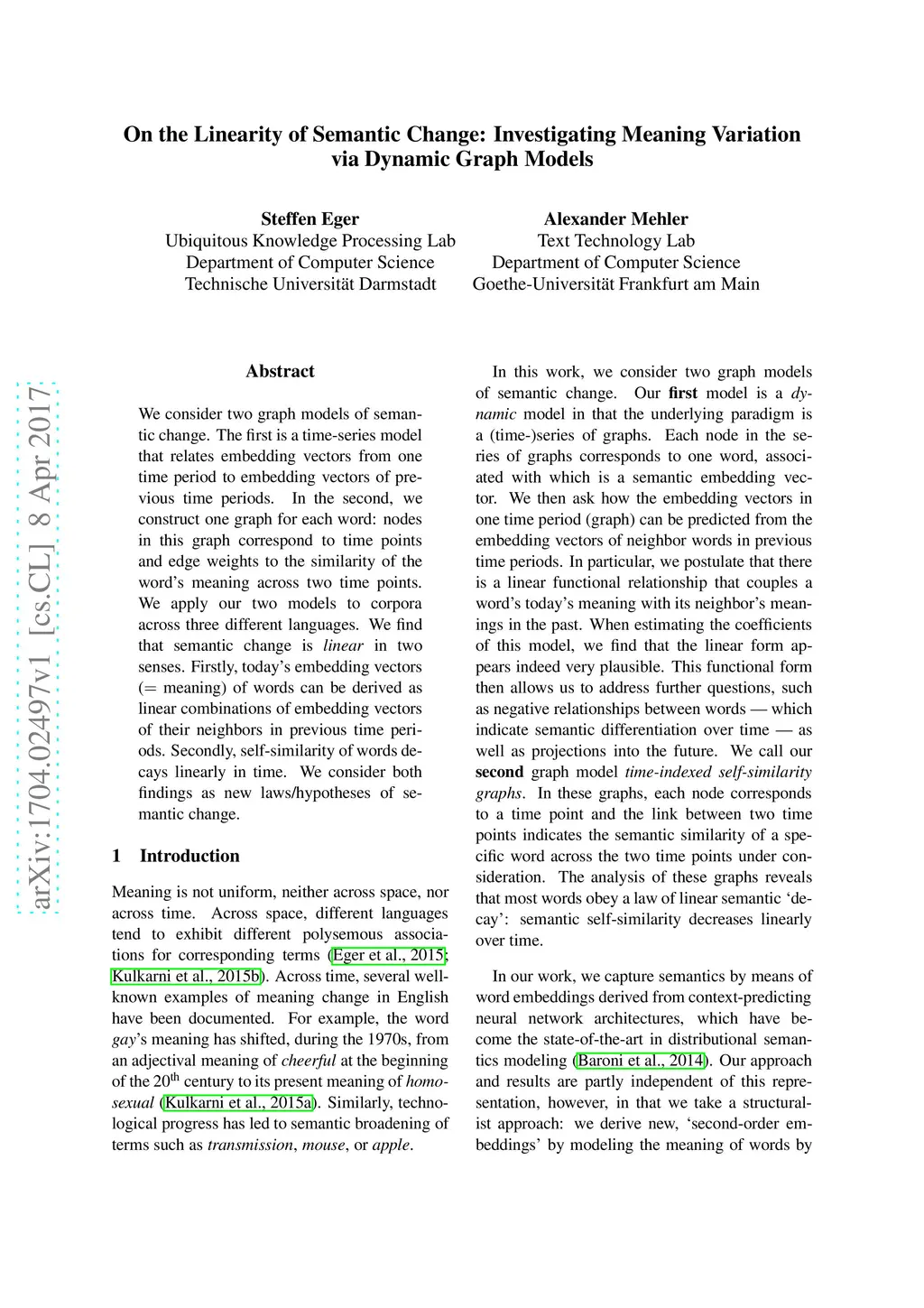 We consider two graph models of semantic change. The first is a time-series model that relates embedding vectors from one time period to embedding vectors of previous time periods. In the second, we construct one graph for each word: nodes in this graph correspond to time points and edge weights to the similarity of the word's meaning across two time points. We apply our two models to corpora across three different languages. We find that semantic change is linear in two senses. Firstly, today's embedding vectors (= meaning) of words can be derived as linear combinations of embedding vectors of their neighbors in previous time periods. Secondly, self-similarity of words decays linearly in time. We consider both findings as new laws/hypotheses of semantic change.