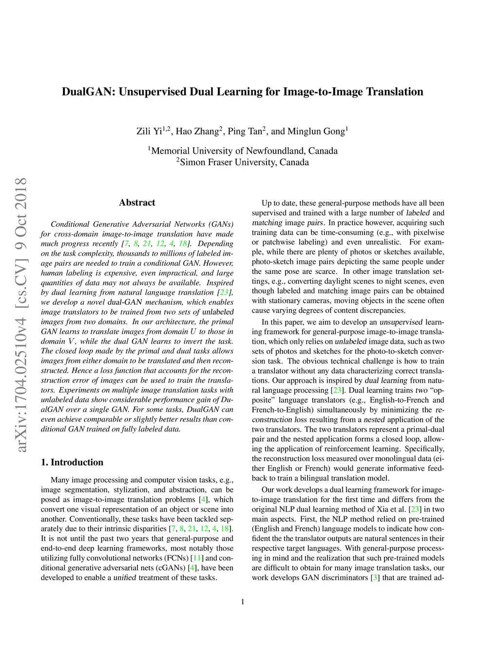 DualGAN: Unsupervised Dual Learning for Image-to-Image Translation