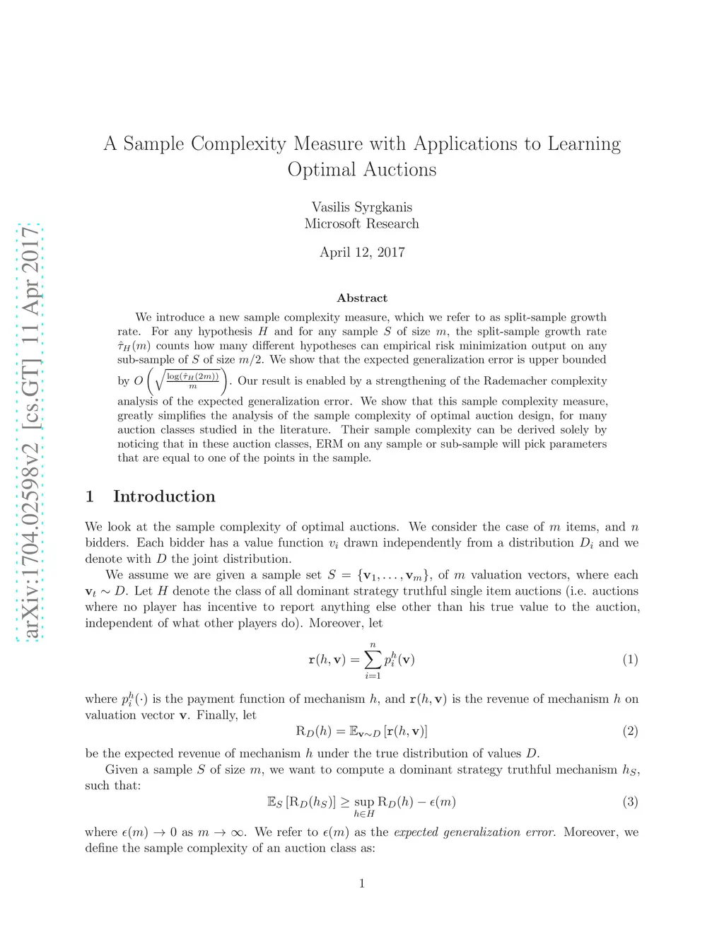 We introduce a new sample complexity measure, which we refer to as split-sample growth rate. For any hypothesis HH and for any sample SS of size mm, the split-sample growth rate τ^H(m)\hat{\tau}_H(m) counts how many different hypotheses can empirical risk minimization output on any sub-sample of SS of size m/2m/2. We show that the expected generalization error is upper bounded by O(log(τ^H(2m))m)O\left(\sqrt{\frac{\log(\hat{\tau}_H(2m))}{m}}\right). Our result is enabled by a strengthening of the Rademacher complexity analysis of the expected generalization error. We show that this sample complexity measure, greatly simplifies the analysis of the sample complexity of optimal auction design, for many auction classes studied in the literature. Their sample complexity can be derived solely by noticing that in these auction classes, ERM on any sample or sub-sample will pick parameters that are equal to one of the points in the sample.