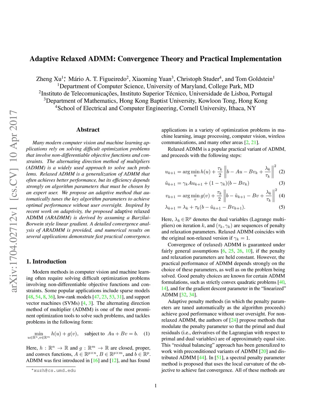 Many modern computer vision and machine learning applications rely on solving difficult optimization problems that involve non-differentiable objective functions and constraints. The alternating direction method of multipliers (ADMM) is a widely used approach to solve such problems. Relaxed ADMM is a generalization of ADMM that often achieves better performance, but its efficiency depends strongly on algorithm parameters that must be chosen by an expert user. We propose an adaptive method that automatically tunes the key algorithm parameters to achieve optimal performance without user oversight. Inspired by recent work on adaptivity, the proposed adaptive relaxed ADMM (ARADMM) is derived by assuming a Barzilai-Borwein style linear gradient. A detailed convergence analysis of ARADMM is provided, and numerical results on several applications demonstrate fast practical convergence.