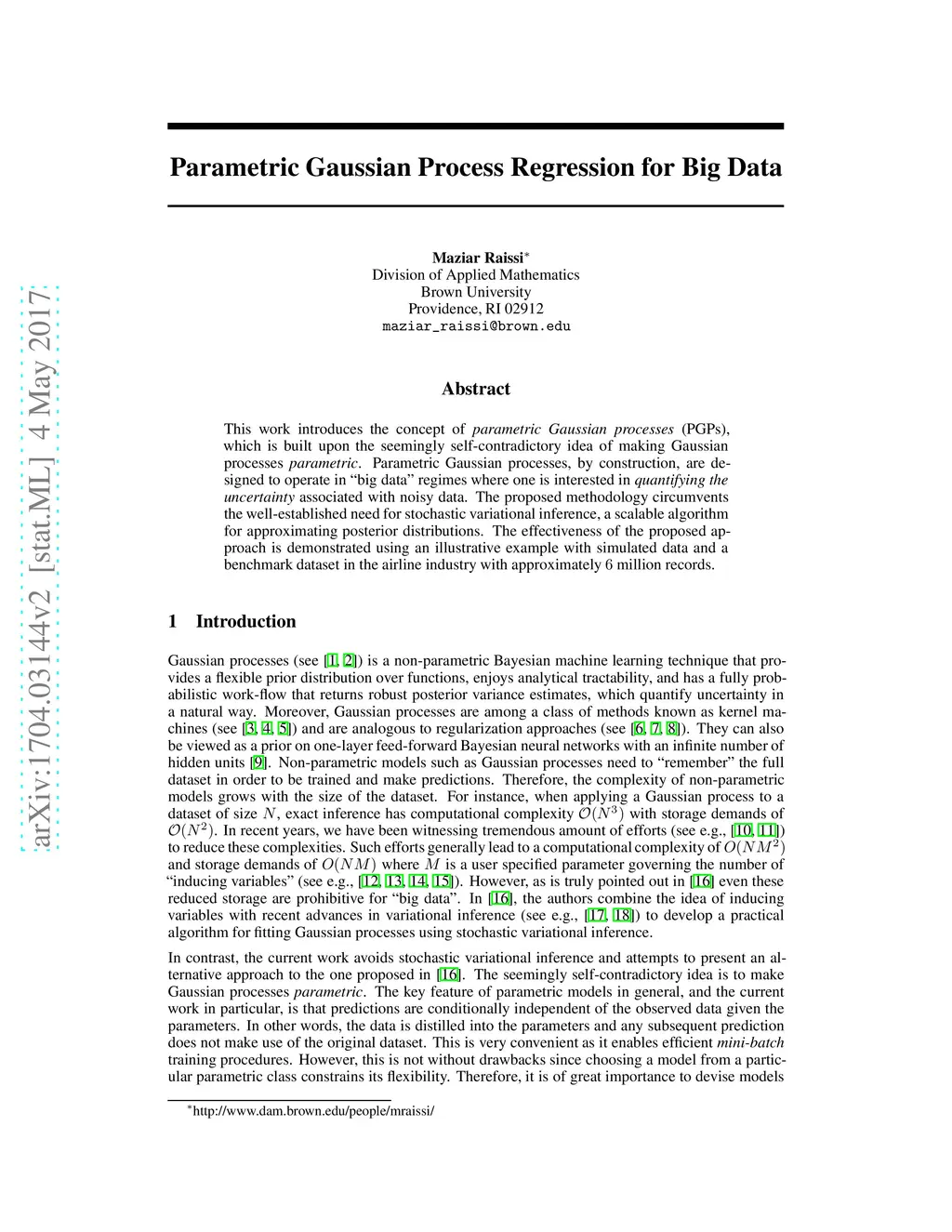 This work introduces the concept of parametric Gaussian processes (PGPs), which is built upon the seemingly self-contradictory idea of making Gaussian processes parametric. Parametric Gaussian processes, by construction, are designed to operate in "big data" regimes where one is interested in quantifying the uncertainty associated with noisy data. The proposed methodology circumvents the well-established need for stochastic variational inference, a scalable algorithm for approximating posterior distributions. The effectiveness of the proposed approach is demonstrated using an illustrative example with simulated data and a benchmark dataset in the airline industry with approximately 6 million records.