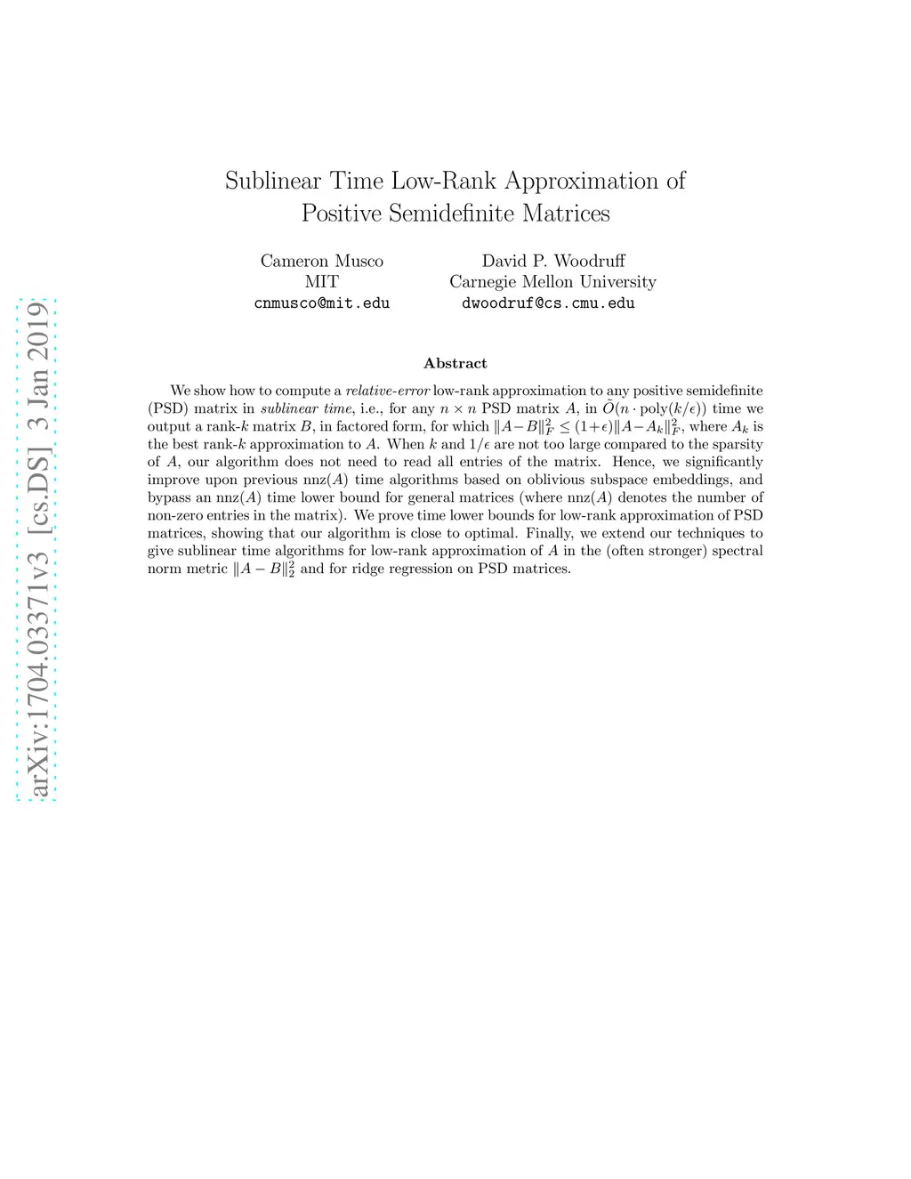 We show how to compute a relative-error low-rank approximation to any positive semidefinite (PSD) matrix in sublinear time, i.e., for any PSD matrix , in time we output a rank- matrix , in factored form, for which , where is the best rank- approximation to . When and are not too large compared to the sparsity of , our algorithm does not need to read all entries of the matrix. Hence, we significantly improve upon previous time algorithms based on oblivious subspace embeddings, and bypass an time lower bound for general matrices (where denotes the number of non-zero entries in the matrix). We prove time lower bounds for low-rank approximation of PSD matrices, showing that our algorithm is close to optimal. Finally, we extend our techniques to give sublinear time algorithms for low-rank approximation of in the (often stronger) spectral norm metric and for ridge regression on PSD matrices.