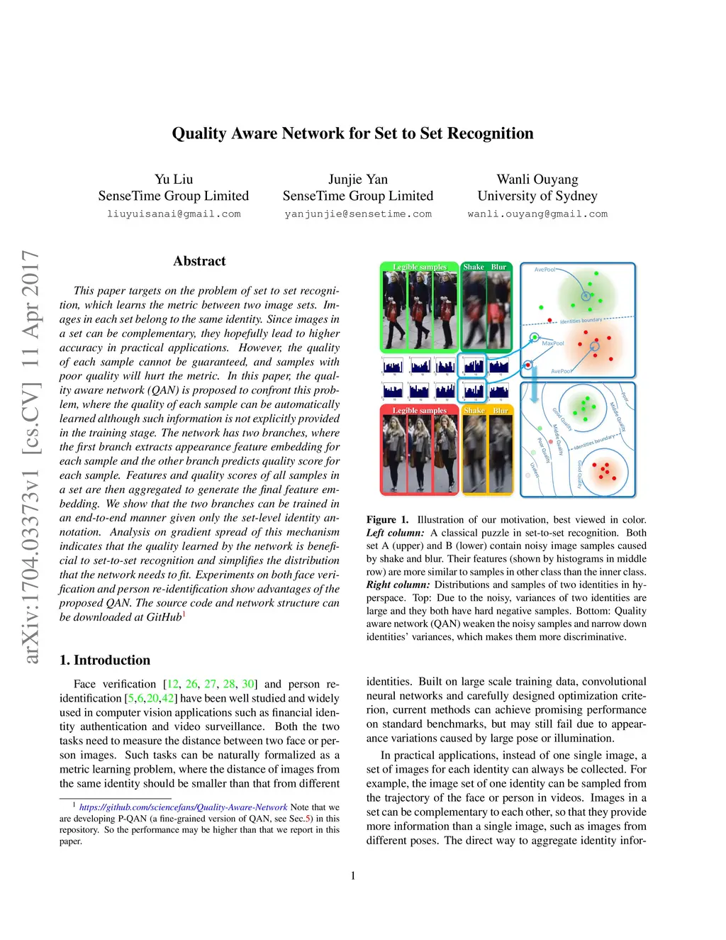 This paper targets on the problem of set to set recognition, which learns the metric between two image sets. Images in each set belong to the same identity. Since images in a set can be complementary, they hopefully lead to higher accuracy in practical applications. However, the quality of each sample cannot be guaranteed, and samples with poor quality will hurt the metric. In this paper, the quality aware network (QAN) is proposed to confront this problem, where the quality of each sample can be automatically learned although such information is not explicitly provided in the training stage. The network has two branches, where the first branch extracts appearance feature embedding for each sample and the other branch predicts quality score for each sample. Features and quality scores of all samples in a set are then aggregated to generate the final feature embedding. We show that the two branches can be trained in an end-to-end manner given only the set-level identity annotation. Analysis on gradient spread of this mechanism indicates that the quality learned by the network is beneficial to set-to-set recognition and simplifies the distribution that the network needs to fit. Experiments on both face verification and person re-identification show advantages of the proposed QAN. The source code and network structure can be downloaded at https://github.com/sciencefans/Quality-Aware-Network.