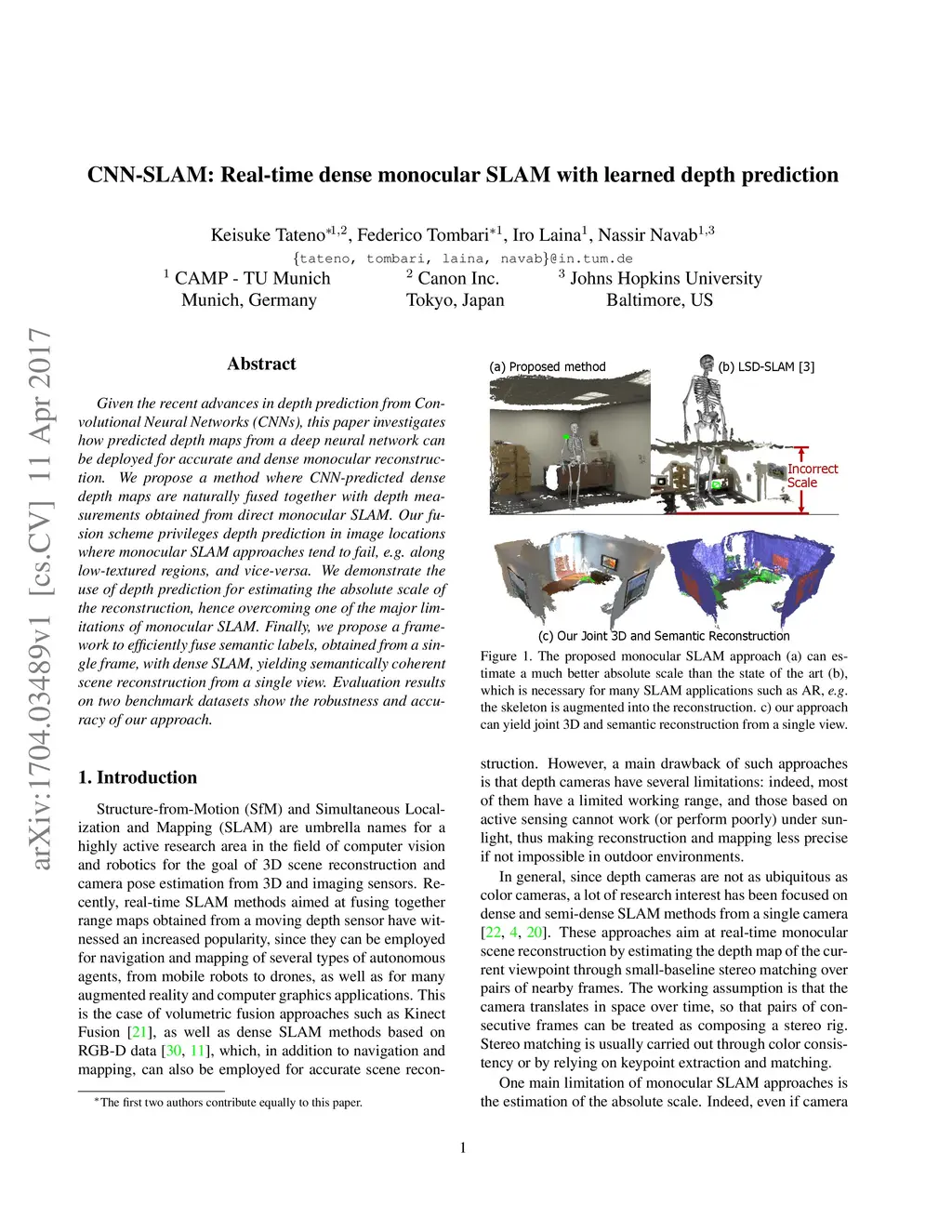 CNN-SLAM: Real-time dense monocular SLAM with learned depth prediction