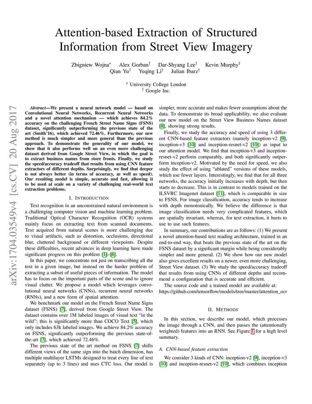 We present a neural network model - based on CNNs, RNNs and a novel attention mechanism - which achieves 84.2% accuracy on the challenging French Street Name Signs (FSNS) dataset, significantly outperforming the previous state of the art (Smith'16), which achieved 72.46%. Furthermore, our new method is much simpler and more general than the previous approach. To demonstrate the generality of our model, we show that it also performs well on an even more challenging dataset derived from Google Street View, in which the goal is to extract business names from store fronts. Finally, we study the speed/accuracy tradeoff that results from using CNN feature extractors of different depths. Surprisingly, we find that deeper is not always better (in terms of accuracy, as well as speed). Our resulting model is simple, accurate and fast, allowing it to be used at scale on a variety of challenging real-world text extraction problems.