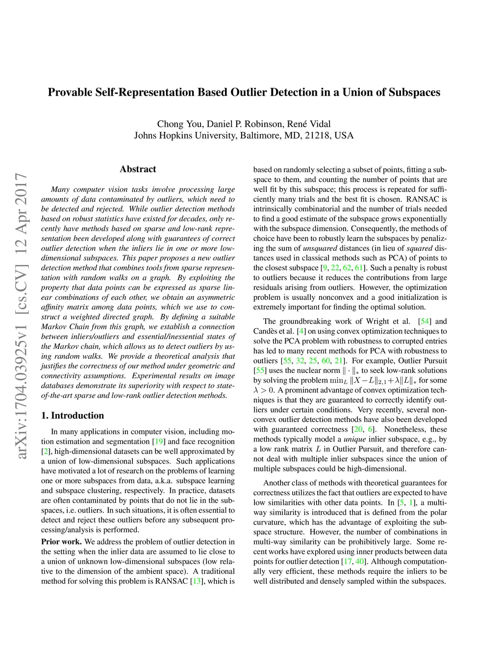 Many computer vision tasks involve processing large amounts of data contaminated by outliers, which need to be detected and rejected. While outlier detection methods based on robust statistics have existed for decades, only recently have methods based on sparse and low-rank representation been developed along with guarantees of correct outlier detection when the inliers lie in one or more low-dimensional subspaces. This paper proposes a new outlier detection method that combines tools from sparse representation with random walks on a graph. By exploiting the property that data points can be expressed as sparse linear combinations of each other, we obtain an asymmetric affinity matrix among data points, which we use to construct a weighted directed graph. By defining a suitable Markov Chain from this graph, we establish a connection between inliers/outliers and essential/inessential states of the Markov chain, which allows us to detect outliers by using random walks. We provide a theoretical analysis that justifies the correctness of our method under geometric and connectivity assumptions. Experimental results on image databases demonstrate its superiority with respect to state-of-the-art sparse and low-rank outlier detection methods.