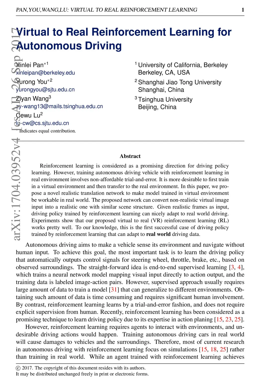 Reinforcement learning is considered as a promising direction for driving policy learning. However, training autonomous driving vehicle with reinforcement learning in real environment involves non-affordable trial-and-error. It is more desirable to first train in a virtual environment and then transfer to the real environment. In this paper, we propose a novel realistic translation network to make model trained in virtual environment be workable in real world. The proposed network can convert non-realistic virtual image input into a realistic one with similar scene structure. Given realistic frames as input, driving policy trained by reinforcement learning can nicely adapt to real world driving. Experiments show that our proposed virtual to real (VR) reinforcement learning (RL) works pretty well. To our knowledge, this is the first successful case of driving policy trained by reinforcement learning that can adapt to real world driving data.