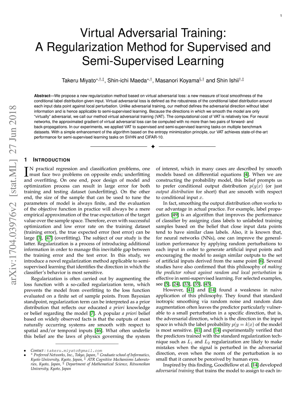 Virtual Adversarial Training: A Regularization Method for Supervised and