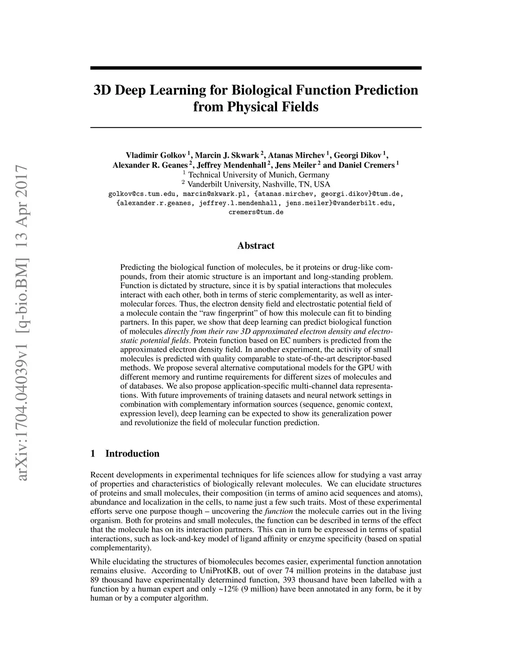 3D Deep Learning for Biological Function Prediction from Physical Fields
