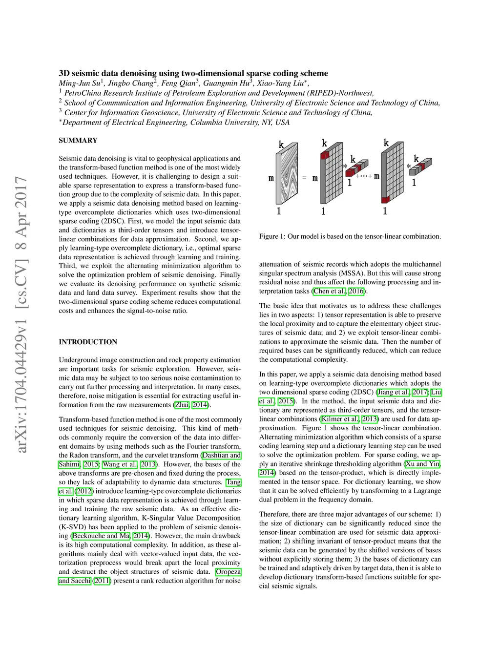 Seismic data denoising is vital to geophysical applications and the transform-based function method is one of the most widely used techniques. However, it is challenging to design a suit- able sparse representation to express a transform-based func- tion group due to the complexity of seismic data. In this paper, we apply a seismic data denoising method based on learning- type overcomplete dictionaries which uses two-dimensional sparse coding (2DSC). First, we model the input seismic data and dictionaries as third-order tensors and introduce tensor- linear combinations for data approximation. Second, we ap- ply learning-type overcomplete dictionary, i.e., optimal sparse data representation is achieved through learning and training. Third, we exploit the alternating minimization algorithm to solve the optimization problem of seismic denoising. Finally we evaluate its denoising performance on synthetic seismic data and land data survey. Experiment results show that the two-dimensional sparse coding scheme reduces computational costs and enhances the signal-to-noise ratio.
