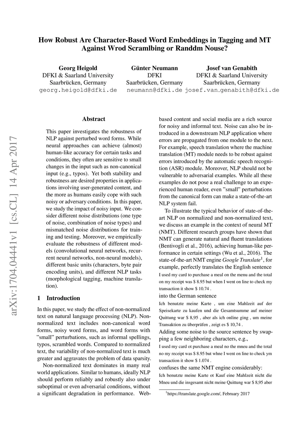 This paper investigates the robustness of NLP against perturbed word forms. While neural approaches can achieve (almost) human-like accuracy for certain tasks and conditions, they often are sensitive to small changes in the input such as non-canonical input (e.g., typos). Yet both stability and robustness are desired properties in applications involving user-generated content, and the more as humans easily cope with such noisy or adversary conditions. In this paper, we study the impact of noisy input. We consider different noise distributions (one type of noise, combination of noise types) and mismatched noise distributions for training and testing. Moreover, we empirically evaluate the robustness of different models (convolutional neural networks, recurrent neural networks, non-neural models), different basic units (characters, byte pair encoding units), and different NLP tasks (morphological tagging, machine translation).
