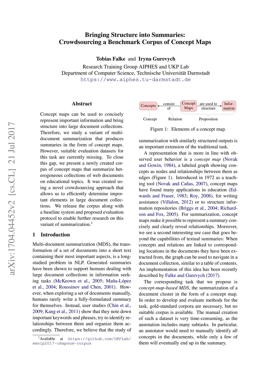 Concept maps can be used to concisely represent important information and bring structure into large document collections. Therefore, we study a variant of multi-document summarization that produces summaries in the form of concept maps. However, suitable evaluation datasets for this task are currently missing. To close this gap, we present a newly created corpus of concept maps that summarize heterogeneous collections of web documents on educational topics. It was created using a novel crowdsourcing approach that allows us to efficiently determine important elements in large document collections. We release the corpus along with a baseline system and proposed evaluation protocol to enable further research on this variant of summarization.