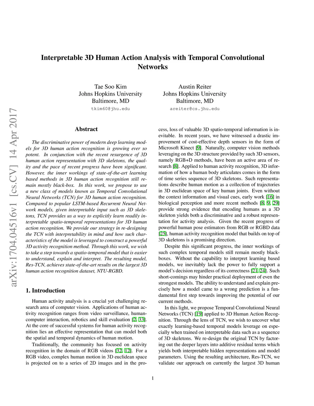 The discriminative power of modern deep learning models for 3D human action recognition is growing ever so potent. In conjunction with the recent resurgence of 3D human action representation with 3D skeletons, the quality and the pace of recent progress have been significant. However, the inner workings of state-of-the-art learning based methods in 3D human action recognition still remain mostly black-box. In this work, we propose to use a new class of models known as Temporal Convolutional Neural Networks (TCN) for 3D human action recognition. Compared to popular LSTM-based Recurrent Neural Network models, given interpretable input such as 3D skeletons, TCN provides us a way to explicitly learn readily interpretable spatio-temporal representations for 3D human action recognition. We provide our strategy in re-designing the TCN with interpretability in mind and how such characteristics of the model is leveraged to construct a powerful 3D activity recognition method. Through this work, we wish to take a step towards a spatio-temporal model that is easier to understand, explain and interpret. The resulting model, Res-TCN, achieves state-of-the-art results on the largest 3D human action recognition dataset, NTU-RGBD.
