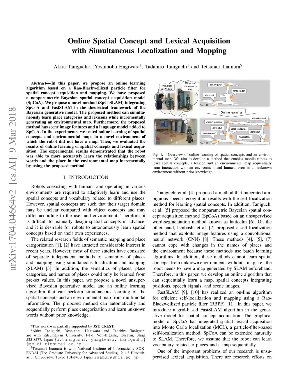 In this paper, we propose an online learning algorithm based on a Rao-Blackwellized particle filter for spatial concept acquisition and mapping. We have proposed a nonparametric Bayesian spatial concept acquisition model (SpCoA). We propose a novel method (SpCoSLAM) integrating SpCoA and FastSLAM in the theoretical framework of the Bayesian generative model. The proposed method can simultaneously learn place categories and lexicons while incrementally generating an environmental map. Furthermore, the proposed method has scene image features and a language model added to SpCoA. In the experiments, we tested online learning of spatial concepts and environmental maps in a novel environment of which the robot did not have a map. Then, we evaluated the results of online learning of spatial concepts and lexical acquisition. The experimental results demonstrated that the robot was able to more accurately learn the relationships between words and the place in the environmental map incrementally by using the proposed method.