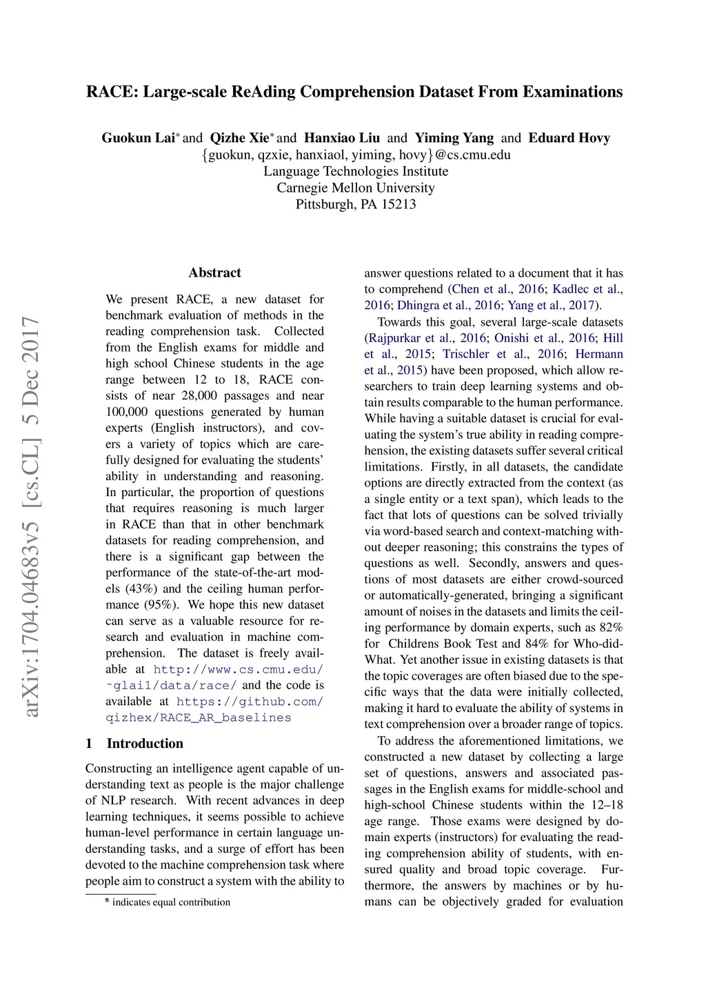 We present RACE, a new dataset for benchmark evaluation of methods in the reading comprehension task. Collected from the English exams for middle and high school Chinese students in the age range between 12 to 18, RACE consists of near 28,000 passages and near 100,000 questions generated by human experts (English instructors), and covers a variety of topics which are carefully designed for evaluating the students' ability in understanding and reasoning. In particular, the proportion of questions that requires reasoning is much larger in RACE than that in other benchmark datasets for reading comprehension, and there is a significant gap between the performance of the state-of-the-art models (43%) and the ceiling human performance (95%). We hope this new dataset can serve as a valuable resource for research and evaluation in machine comprehension. The dataset is freely available at http://www.cs.cmu.edu/~glai1/data/race/ and the code is available at https://github.com/qizhex/RACE_AR_baselines.