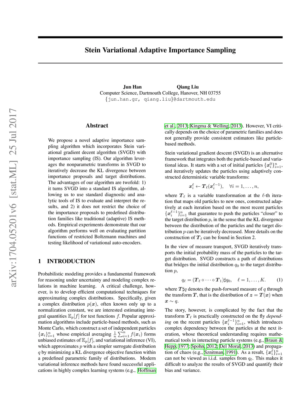 We propose a novel adaptive importance sampling algorithm which incorporates Stein variational gradient decent algorithm (SVGD) with importance sampling (IS). Our algorithm leverages the nonparametric transforms in SVGD to iteratively decrease the KL divergence between our importance proposal and the target distribution. The advantages of this algorithm are twofold: first, our algorithm turns SVGD into a standard IS algorithm, allowing us to use standard diagnostic and analytic tools of IS to evaluate and interpret the results; second, we do not restrict the choice of our importance proposal to predefined distribution families like traditional (adaptive) IS methods. Empirical experiments demonstrate that our algorithm performs well on evaluating partition functions of restricted Boltzmann machines and testing likelihood of variational auto-encoders.
