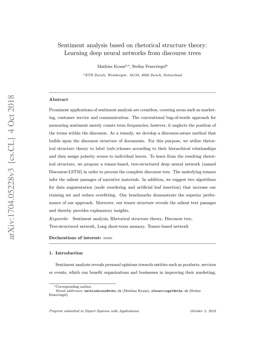 Prominent applications of sentiment analysis are countless, covering areas such as marketing, customer service and communication. The conventional bag-of-words approach for measuring sentiment merely counts term frequencies; however, it neglects the position of the terms within the discourse. As a remedy, we develop a discourse-aware method that builds upon the discourse structure of documents. For this purpose, we utilize rhetorical structure theory to label (sub-)clauses according to their hierarchical relationships and then assign polarity scores to individual leaves. To learn from the resulting rhetorical structure, we propose a tensor-based, tree-structured deep neural network (named Discourse-LSTM) in order to process the complete discourse tree. The underlying tensors infer the salient passages of narrative materials. In addition, we suggest two algorithms for data augmentation (node reordering and artificial leaf insertion) that increase our training set and reduce overfitting. Our benchmarks demonstrate the superior performance of our approach. Moreover, our tensor structure reveals the salient text passages and thereby provides explanatory insights.