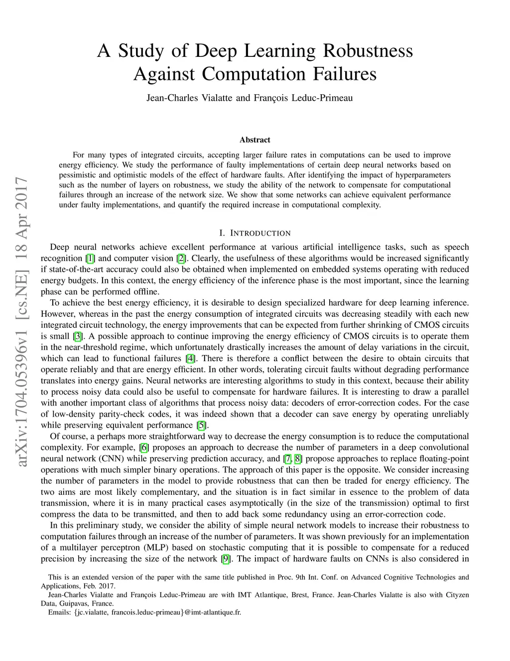 For many types of integrated circuits, accepting larger failure rates in computations can be used to improve energy efficiency. We study the performance of faulty implementations of certain deep neural networks based on pessimistic and optimistic models of the effect of hardware faults. After identifying the impact of hyperparameters such as the number of layers on robustness, we study the ability of the network to compensate for computational failures through an increase of the network size. We show that some networks can achieve equivalent performance under faulty implementations, and quantify the required increase in computational complexity.