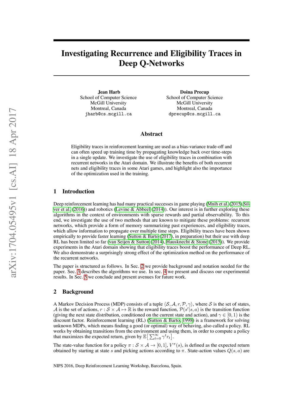 Eligibility traces in reinforcement learning are used as a bias-variance trade-off and can often speed up training time by propagating knowledge back over time-steps in a single update. We investigate the use of eligibility traces in combination with recurrent networks in the Atari domain. We illustrate the benefits of both recurrent nets and eligibility traces in some Atari games, and highlight also the importance of the optimization used in the training.