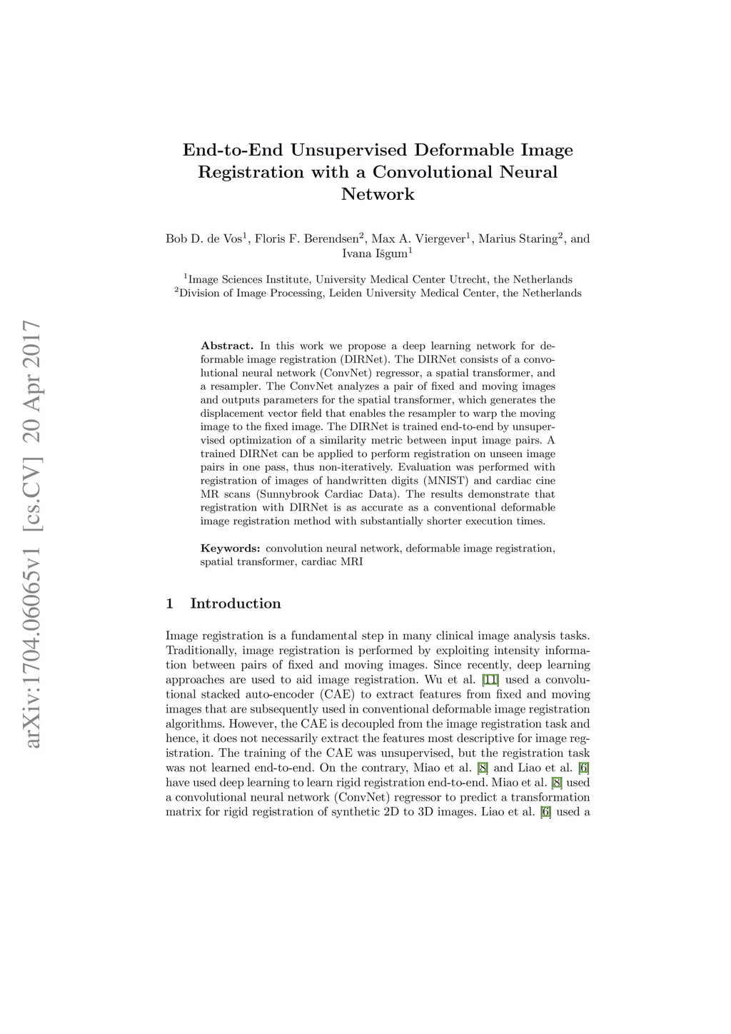 In this work we propose a deep learning network for deformable image registration (DIRNet). The DIRNet consists of a convolutional neural network (ConvNet) regressor, a spatial transformer, and a resampler. The ConvNet analyzes a pair of fixed and moving images and outputs parameters for the spatial transformer, which generates the displacement vector field that enables the resampler to warp the moving image to the fixed image. The DIRNet is trained end-to-end by unsupervised optimization of a similarity metric between input image pairs. A trained DIRNet can be applied to perform registration on unseen image pairs in one pass, thus non-iteratively. Evaluation was performed with registration of images of handwritten digits (MNIST) and cardiac cine MR scans (Sunnybrook Cardiac Data). The results demonstrate that registration with DIRNet is as accurate as a conventional deformable image registration method with substantially shorter execution times.