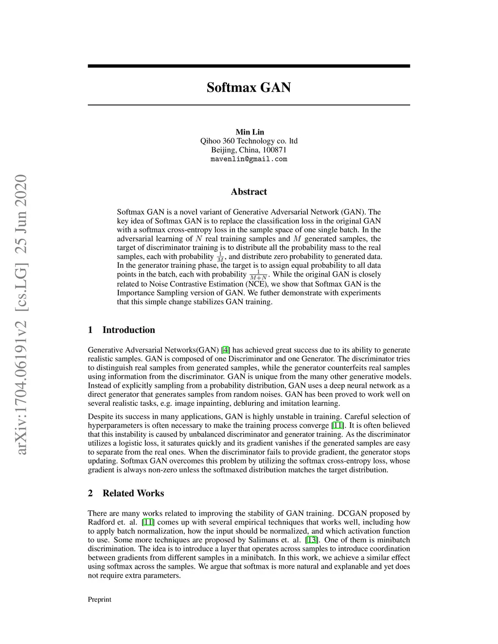 Softmax GAN is a novel variant of Generative Adversarial Network (GAN). The key idea of Softmax GAN is to replace the classification loss in the original GAN with a softmax cross-entropy loss in the sample space of one single batch. In the adversarial learning of real training samples and generated samples, the target of discriminator training is to distribute all the probability mass to the real samples, each with probability , and distribute zero probability to generated data. In the generator training phase, the target is to assign equal probability to all data points in the batch, each with probability . While the original GAN is closely related to Noise Contrastive Estimation (NCE), we show that Softmax GAN is the Importance Sampling version of GAN. We futher demonstrate with experiments that this simple change stabilizes GAN training.