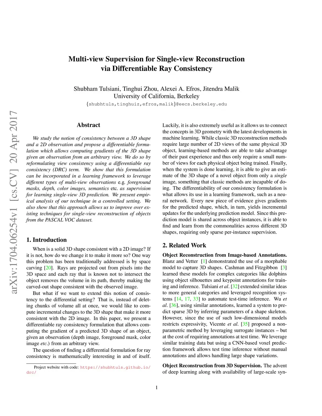 We study the notion of consistency between a 3D shape and a 2D observation and propose a differentiable formulation which allows computing gradients of the 3D shape given an observation from an arbitrary view. We do so by reformulating view consistency using a differentiable ray consistency (DRC) term. We show that this formulation can be incorporated in a learning framework to leverage different types of multi-view observations e.g. foreground masks, depth, color images, semantics etc. as supervision for learning single-view 3D prediction. We present empirical analysis of our technique in a controlled setting. We also show that this approach allows us to improve over existing techniques for single-view reconstruction of objects from the PASCAL VOC dataset.