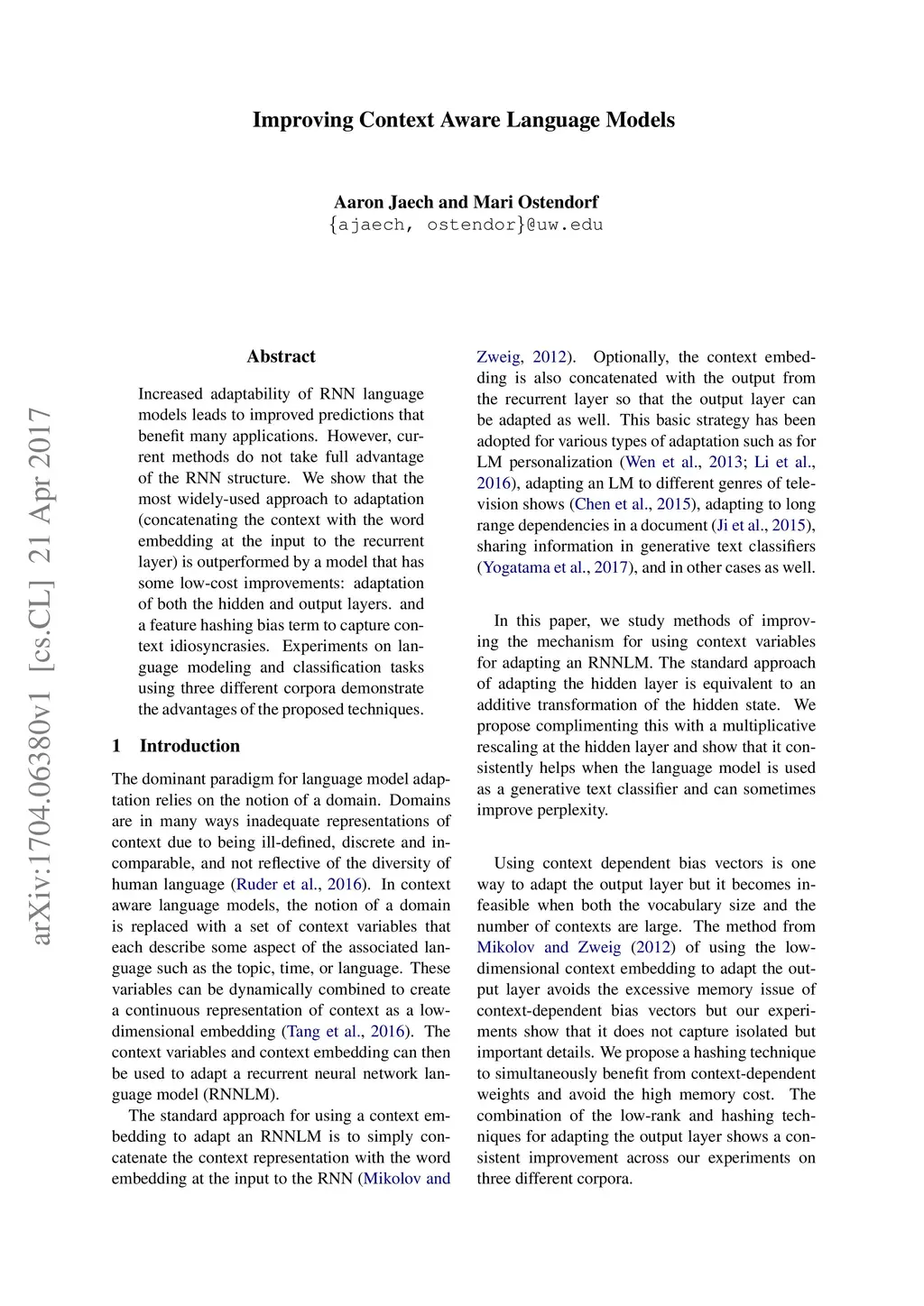 Increased adaptability of RNN language models leads to improved predictions that benefit many applications. However, current methods do not take full advantage of the RNN structure. We show that the most widely-used approach to adaptation (concatenating the context with the word embedding at the input to the recurrent layer) is outperformed by a model that has some low-cost improvements: adaptation of both the hidden and output layers. and a feature hashing bias term to capture context idiosyncrasies. Experiments on language modeling and classification tasks using three different corpora demonstrate the advantages of the proposed techniques.