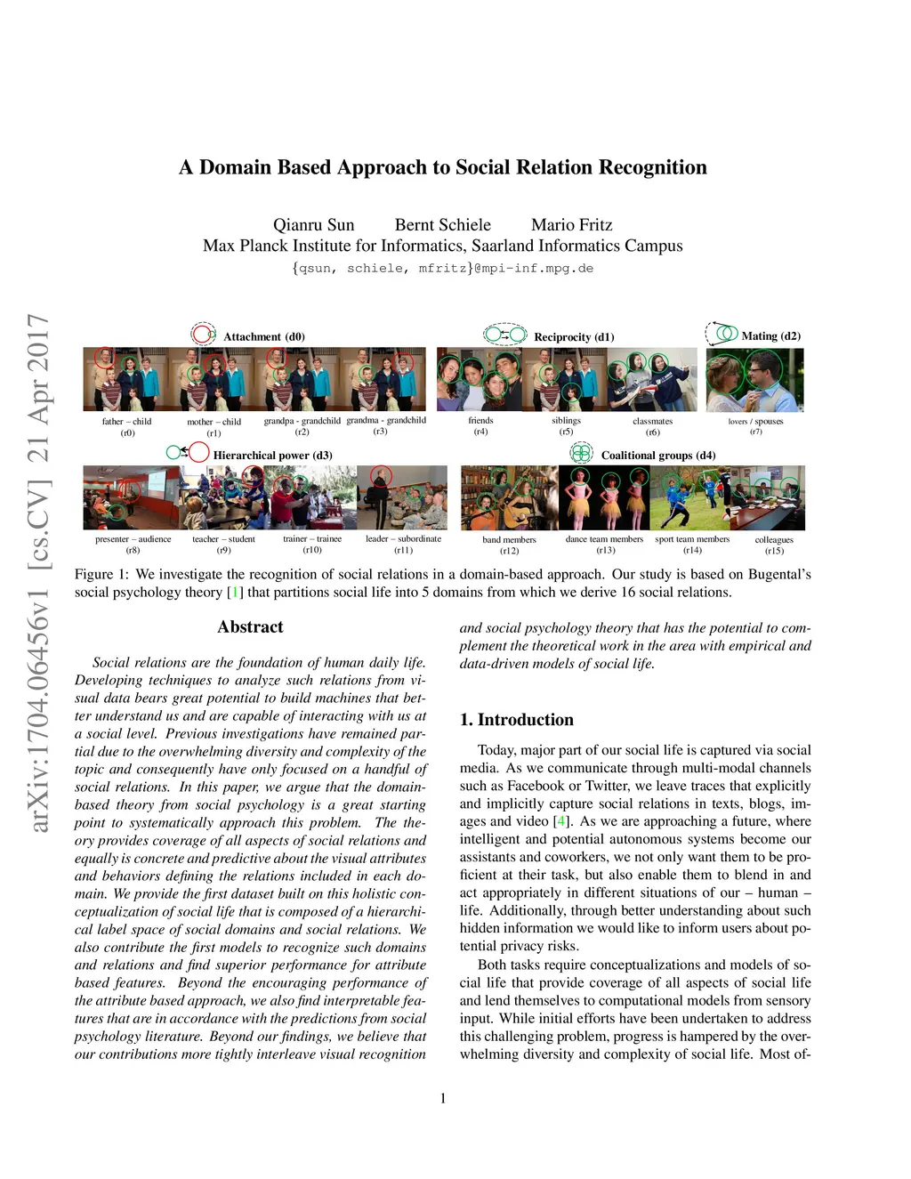 Social relations are the foundation of human daily life. Developing techniques to analyze such relations from visual data bears great potential to build machines that better understand us and are capable of interacting with us at a social level. Previous investigations have remained partial due to the overwhelming diversity and complexity of the topic and consequently have only focused on a handful of social relations. In this paper, we argue that the domain-based theory from social psychology is a great starting point to systematically approach this problem. The theory provides coverage of all aspects of social relations and equally is concrete and predictive about the visual attributes and behaviors defining the relations included in each domain. We provide the first dataset built on this holistic conceptualization of social life that is composed of a hierarchical label space of social domains and social relations. We also contribute the first models to recognize such domains and relations and find superior performance for attribute based features. Beyond the encouraging performance of the attribute based approach, we also find interpretable features that are in accordance with the predictions from social psychology literature. Beyond our findings, we believe that our contributions more tightly interleave visual recognition and social psychology theory that has the potential to complement the theoretical work in the area with empirical and data-driven models of social life.