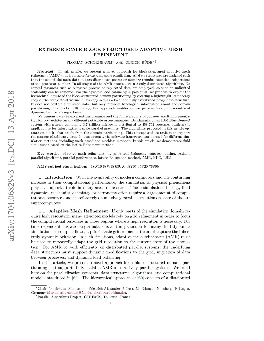 In this article, we present a novel approach for block-structured adaptive mesh refinement (AMR) that is suitable for extreme-scale parallelism. All data structures are designed such that the size of the meta data in each distributed processor memory remains bounded independent of the processor number. In all stages of the AMR process, we use only distributed algorithms. No central resources such as a master process or replicated data are employed, so that an unlimited scalability can be achieved. For the dynamic load balancing in particular, we propose to exploit the hierarchical nature of the block-structured domain partitioning by creating a lightweight, temporary copy of the core data structure. This copy acts as a local and fully distributed proxy data structure. It does not contain simulation data, but only provides topological information about the domain partitioning into blocks. Ultimately, this approach enables an inexpensive, local, diffusion-based dynamic load balancing scheme. We demonstrate the excellent performance and the full scalability of our new AMR implementation for two architecturally different petascale supercomputers. Benchmarks on an IBM Blue Gene/Q system with a mesh containing 3.7 trillion unknowns distributed to 458,752 processes confirm the applicability for future extreme-scale parallel machines. The algorithms proposed in this article operate on blocks that result from the domain partitioning. This concept and its realization support the storage of arbitrary data. In consequence, the software framework can be used for different simulation methods, including mesh based and meshless methods. In this article, we demonstrate fluid simulations based on the lattice Boltzmann method.