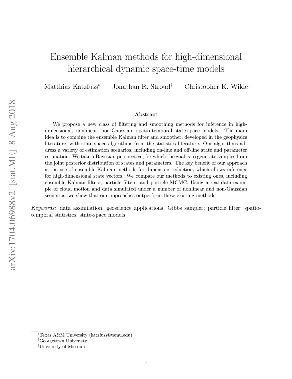 We propose a new class of filtering and smoothing methods for inference in high-dimensional, nonlinear, non-Gaussian, spatio-temporal state-space models. The main idea is to combine the ensemble Kalman filter and smoother, developed in the geophysics literature, with state-space algorithms from the statistics literature. Our algorithms address a variety of estimation scenarios, including on-line and off-line state and parameter estimation. We take a Bayesian perspective, for which the goal is to generate samples from the joint posterior distribution of states and parameters. The key benefit of our approach is the use of ensemble Kalman methods for dimension reduction, which allows inference for high-dimensional state vectors. We compare our methods to existing ones, including ensemble Kalman filters, particle filters, and particle MCMC. Using a real data example of cloud motion and data simulated under a number of nonlinear and non-Gaussian scenarios, we show that our approaches outperform these existing methods.